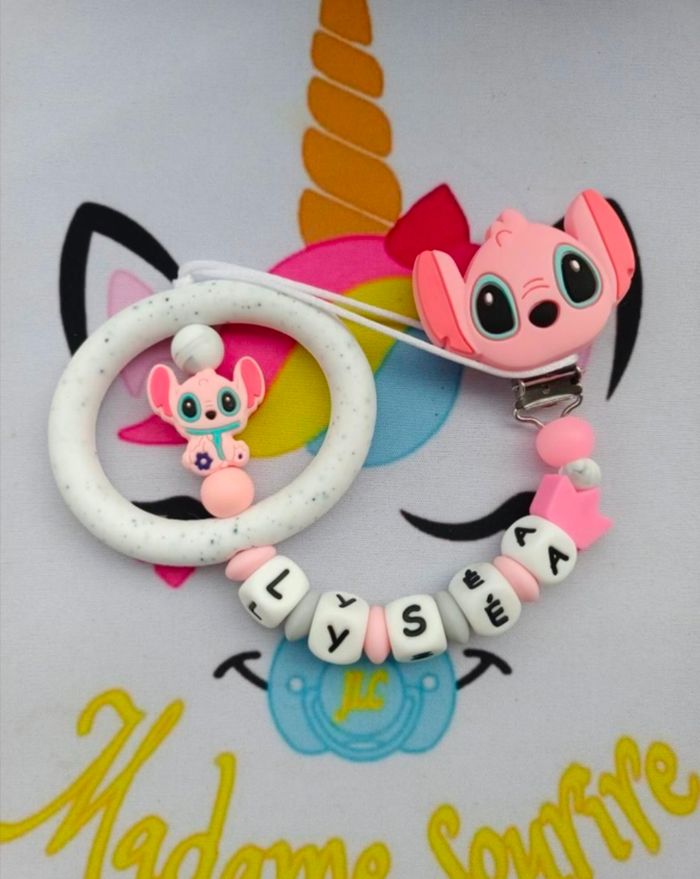 Une Attache tétine Stitch Angel pour ne plus perdre la tétine avec une boucle pour attacher celle-ci (adaptateur MAM disponible pour les tétines MAM dans les accessoires) et un clip pour accrocher l'attache à un tissu sans l'abîmer doublé d'un anneau dentition.