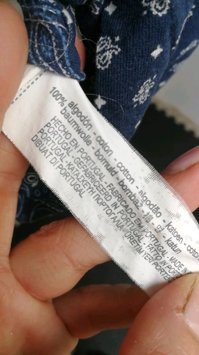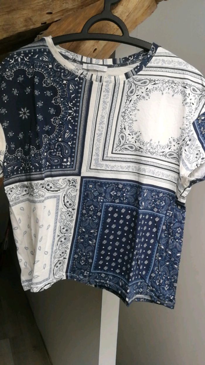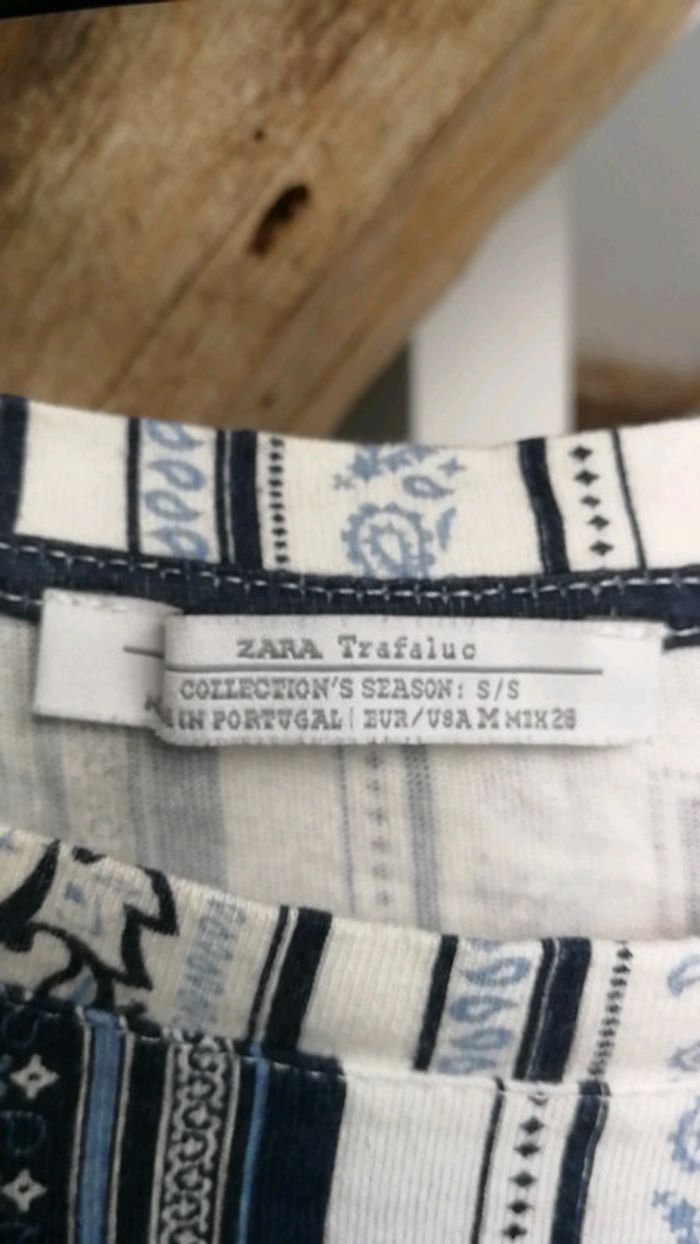 T-shirt Zara bleu et blanc à motifs. Taille M