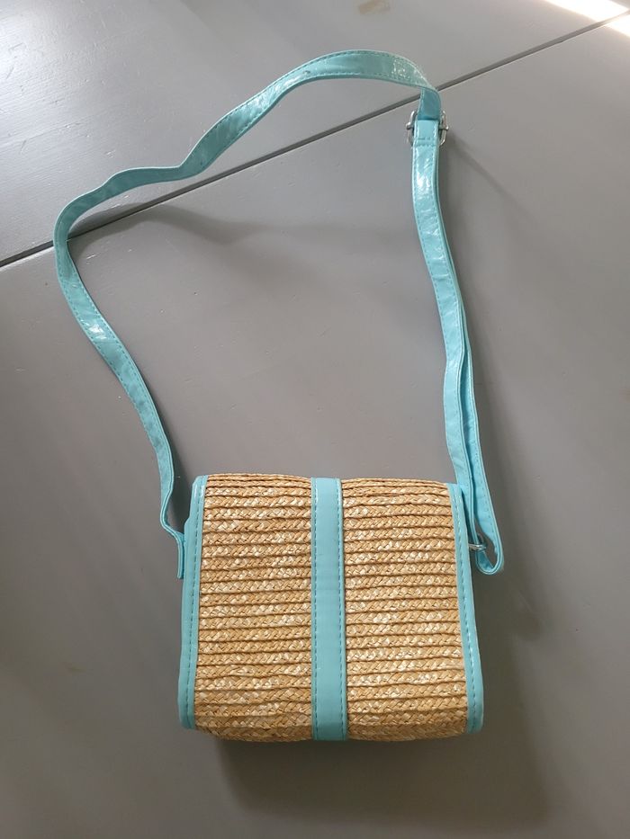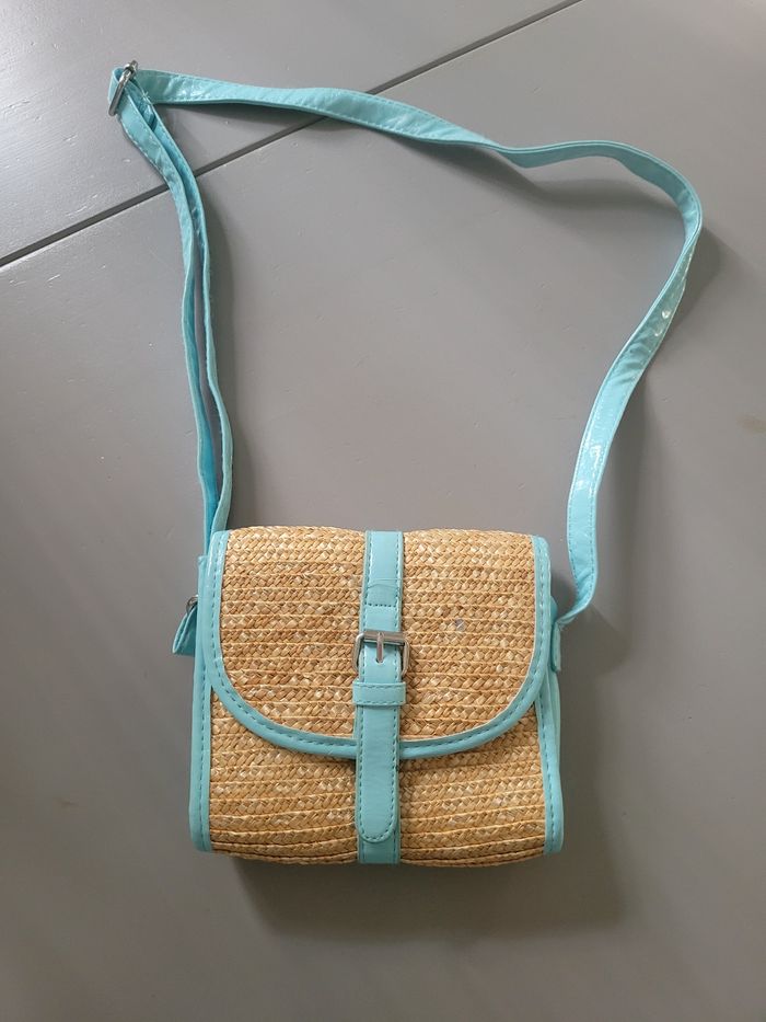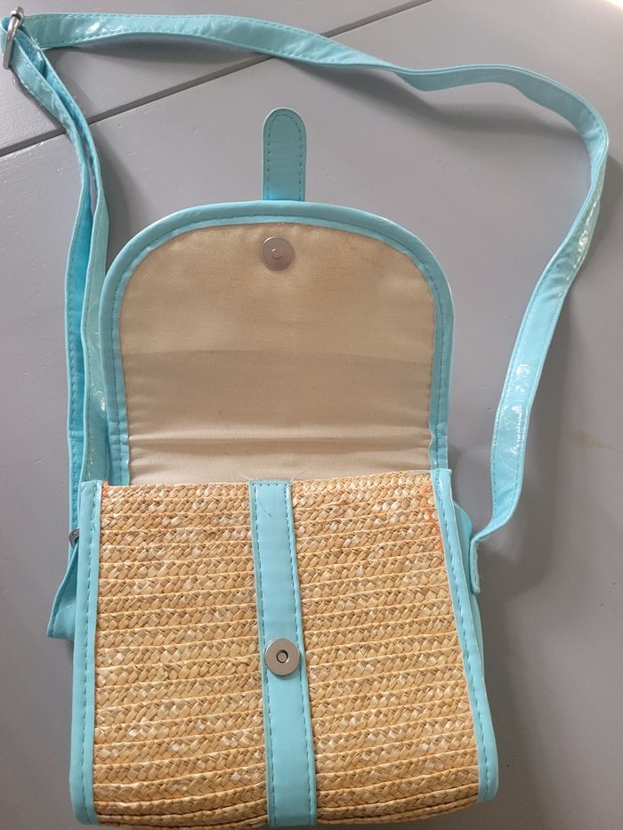 Petit sac avec bandoulière en paille Idéal comme premier petit sac pour petite fille Fermeture par un bouton pression Hauteur sac : 15 cm Largeur sac : 15 cm Profondeur sac : 12 cm Très bon état
