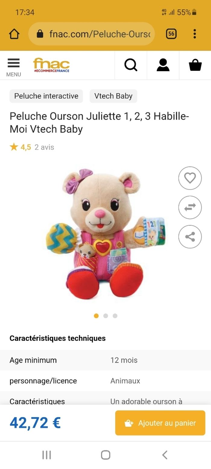 Ourson juliette comme neuf ma fille n'a jamais joué avec. À partir de 12 mois Fait pleins de sons