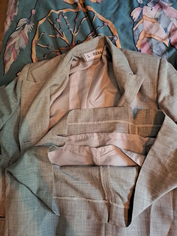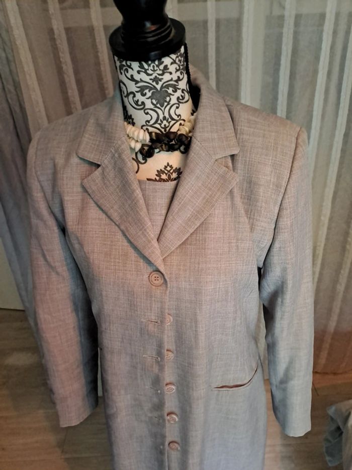 Robe plus veste grise T40 Robe : Epaules 38cm Sous aisselles 48cm Longueur 87cm Veste: Épaules 39cm Sous aisselles 50cm Longueur 92cm Veste avec épaulettes. Très bon état. Tout mes Prix sont négociable dans le raisonnable surtout en lots. #femmeanais #femme38anais #vintage #vintageanais