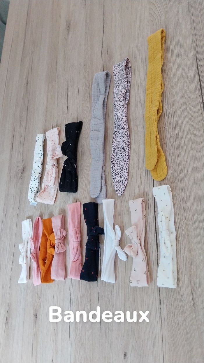15 bandeaux, 4 robes dont une avec culotte, une combi short, 2 tee shirts manches longues, 6 tee shirts manches courte, 1 pull, 7 bodies manches courte, 4 bodies manches longue, 8 pyjamas 1 mois Parfait état Pas d'imperfections