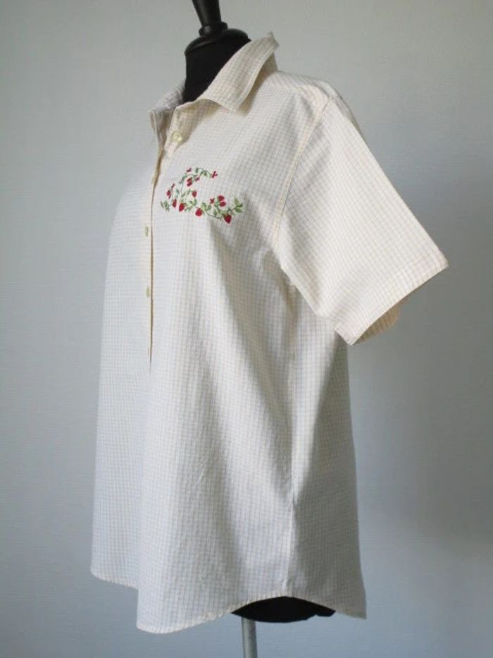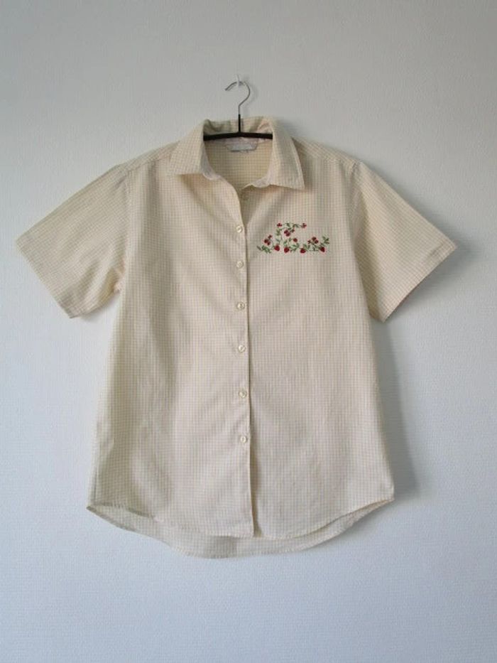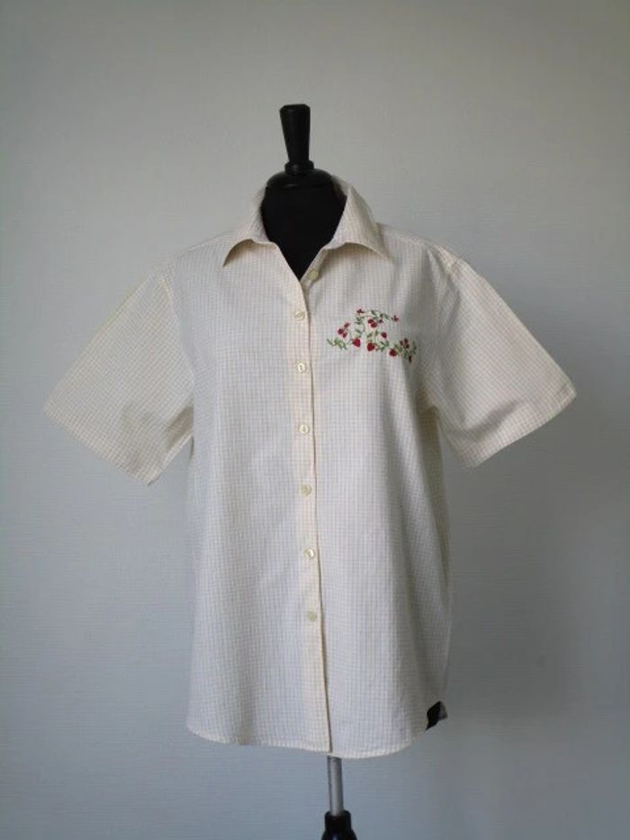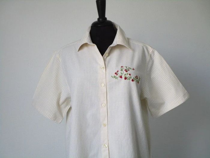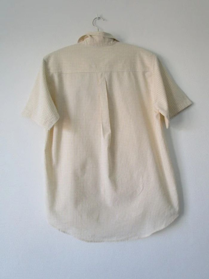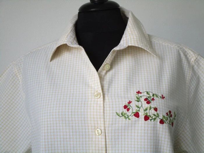 Chemise vichy jaune pâle et blanc Taille 2, correspond à du 42 (cf mesures) Manches courtes Coupe droite Broderies framboises côté gauche de la poitrine 100% coton Largeur carrure : 44 cm Largeur aisselle à aisselle : 53 cm Longueur à l'avant : 71 cm Longueur à l'arrière : 75 cm En très bon état #mamanbrade59femme42