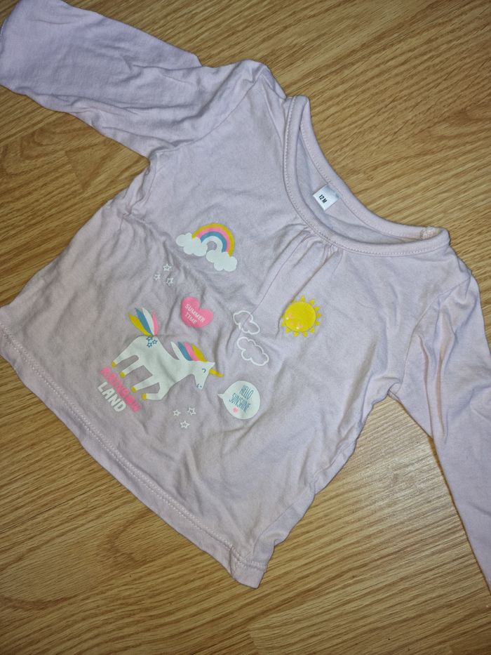 Bonjour, je vends ce maillot à longue manche de couleur rose pâle et imprimer licorne. taille 12 mois