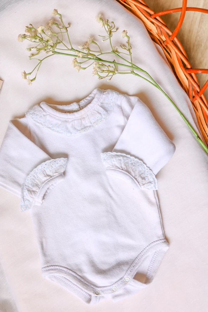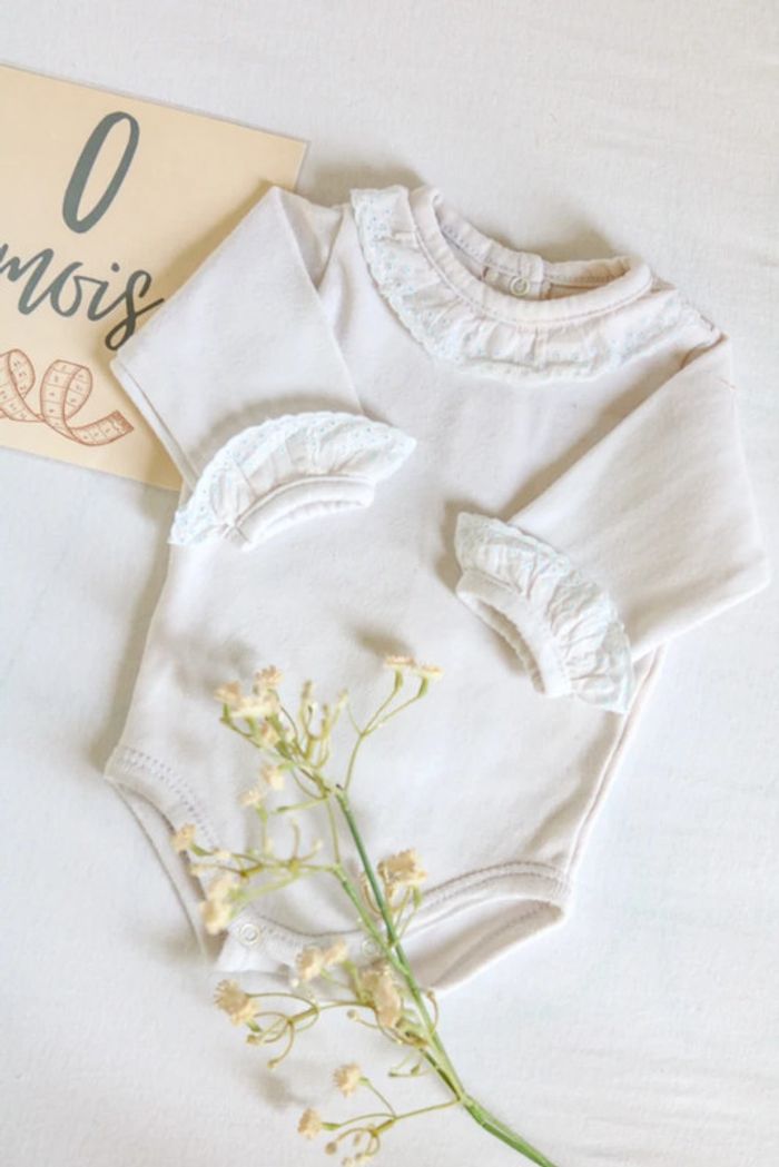 Body blanc manches longues col brodé bleu clair, Vintage, 0 mois - photo numéro 1