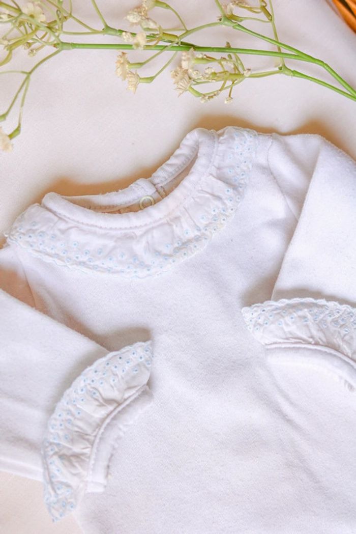 Body blanc manches longues col brodé bleu clair, Vintage, 0 mois