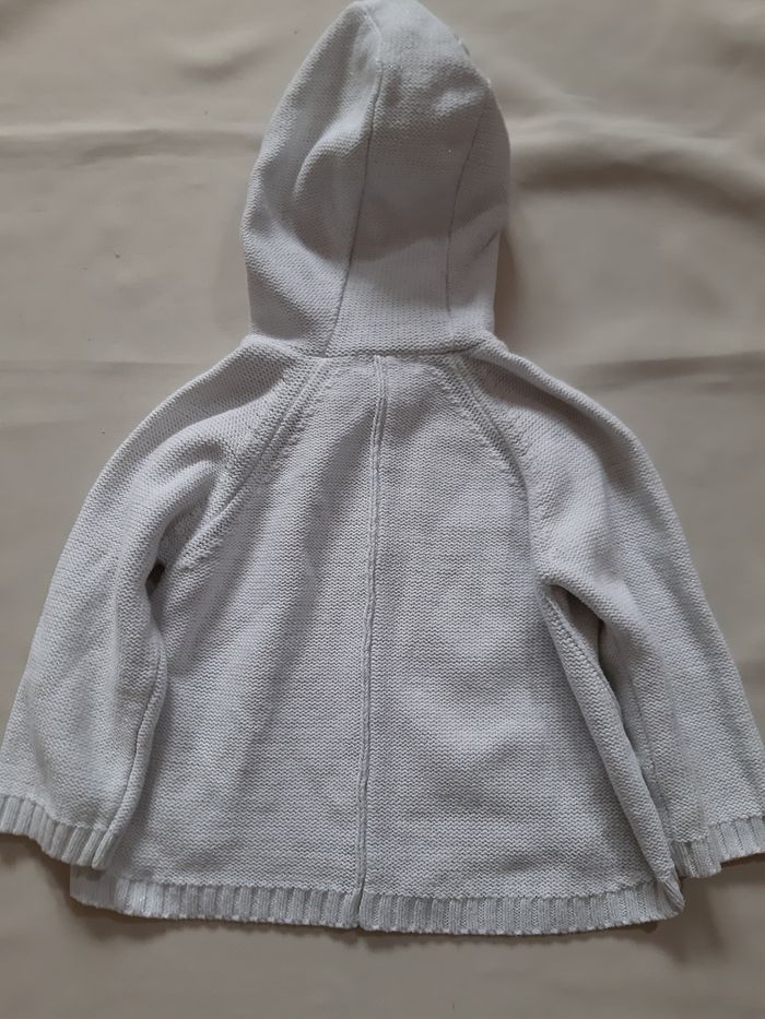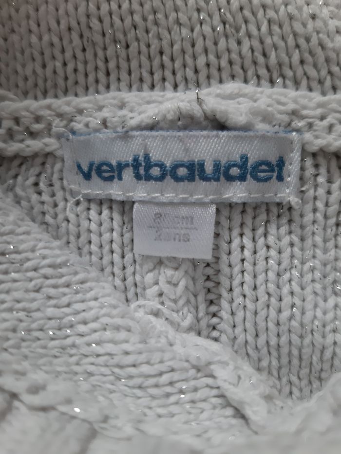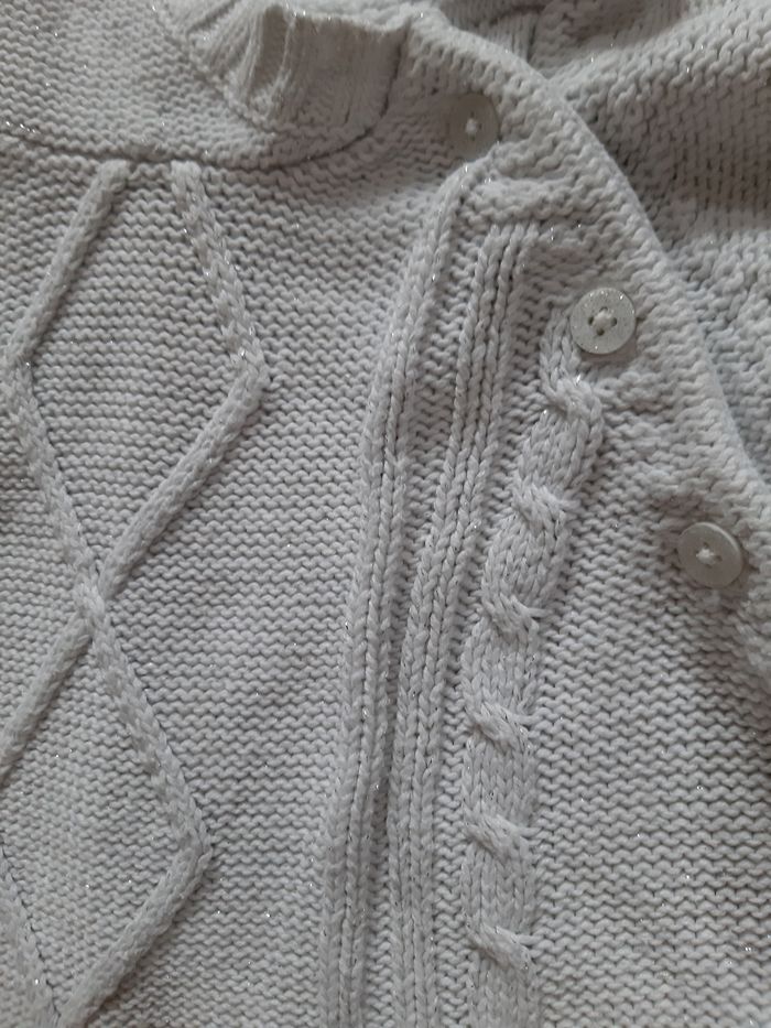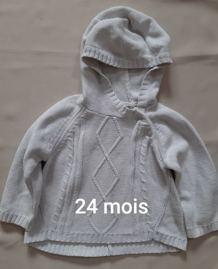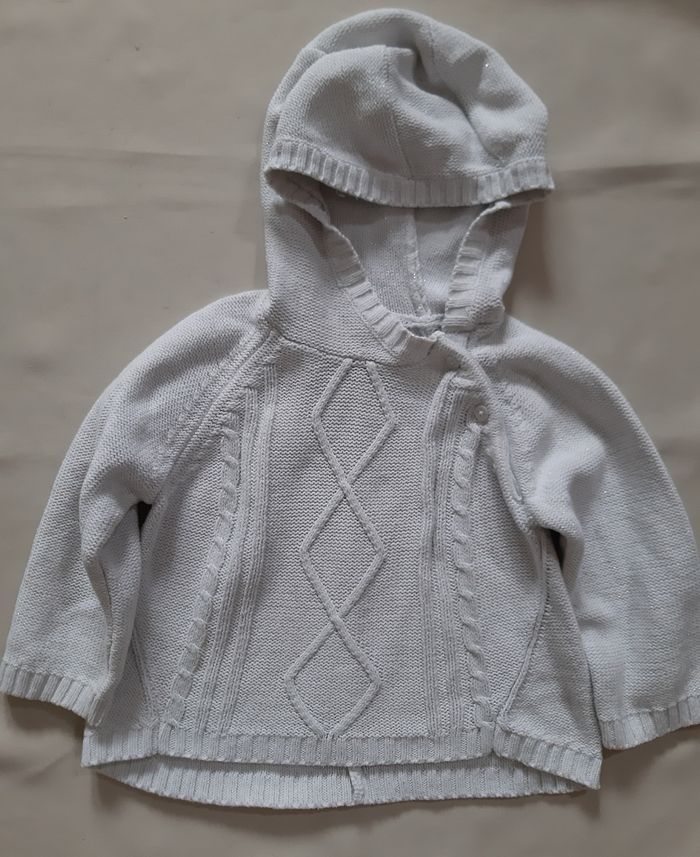 pull à capuche, de la marque Vertbaudet, en taille 24 mois (86 cm) blanc avec effet pailleté (fils métallisés) en coton et acrylique fermeture par 3 boutons (1 bouton de rechange disponible) En très bon état