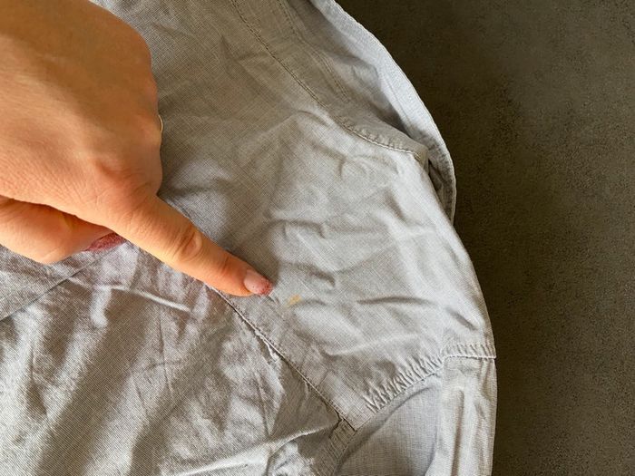 Une toute petite tache au dos qui ne se voit pas beaucoup, voir dernière photo, partira sans doute avec du détachant. N’hésitez pas à regarder mon dressing pour faire un lot.