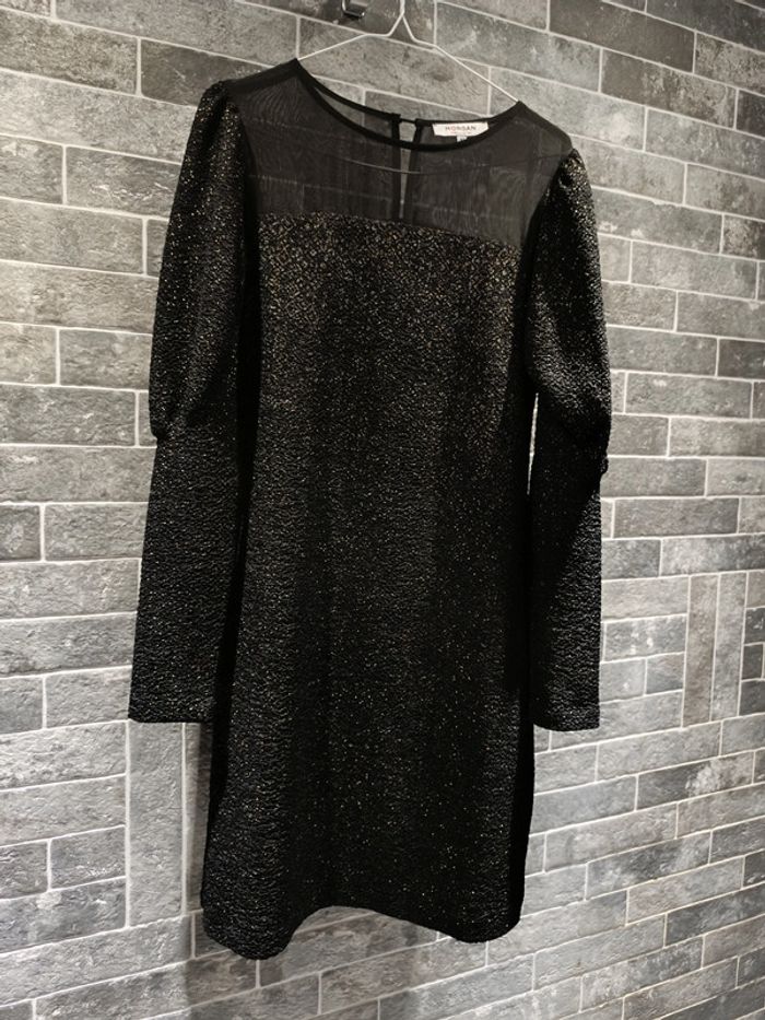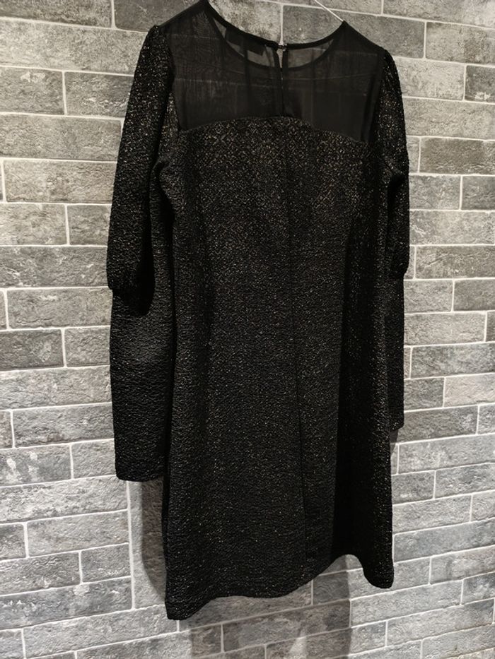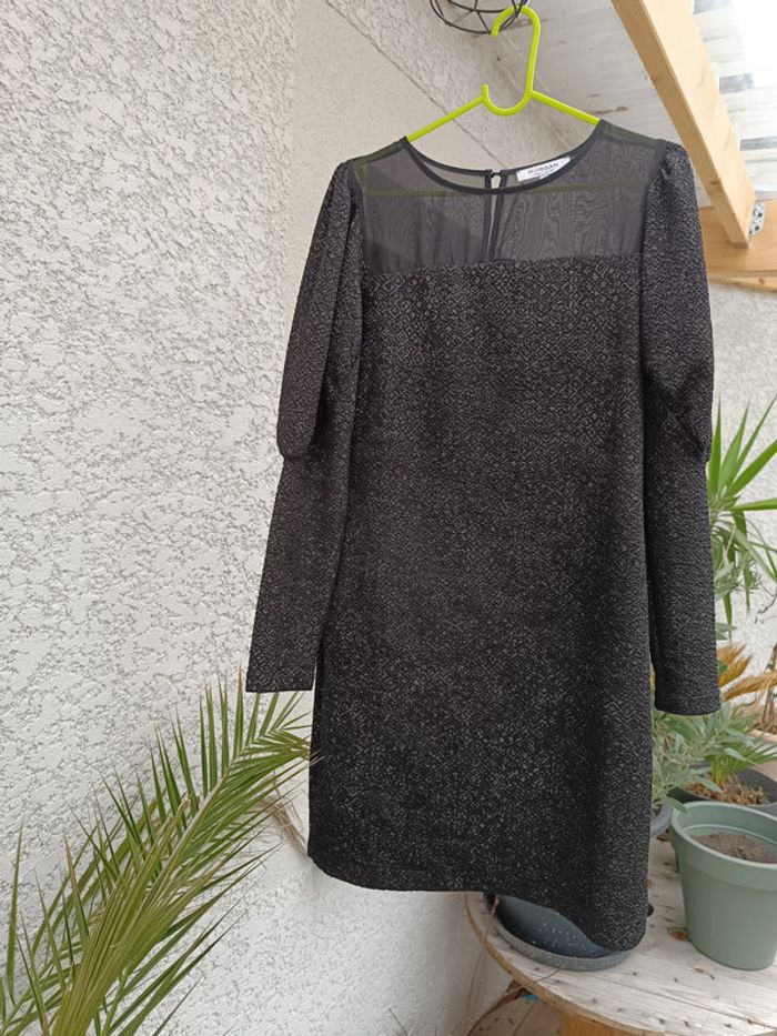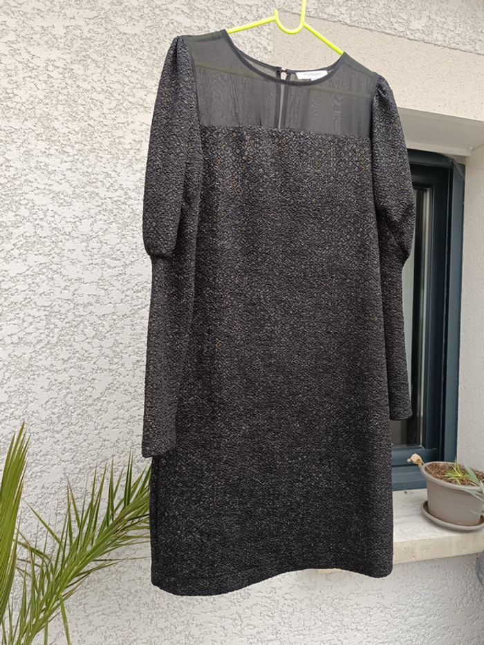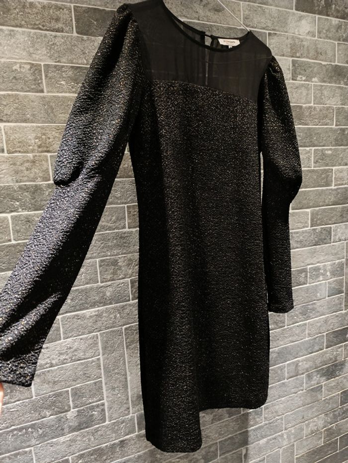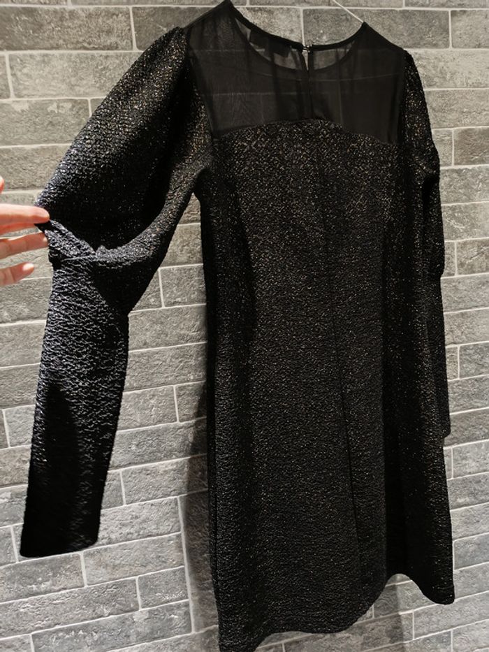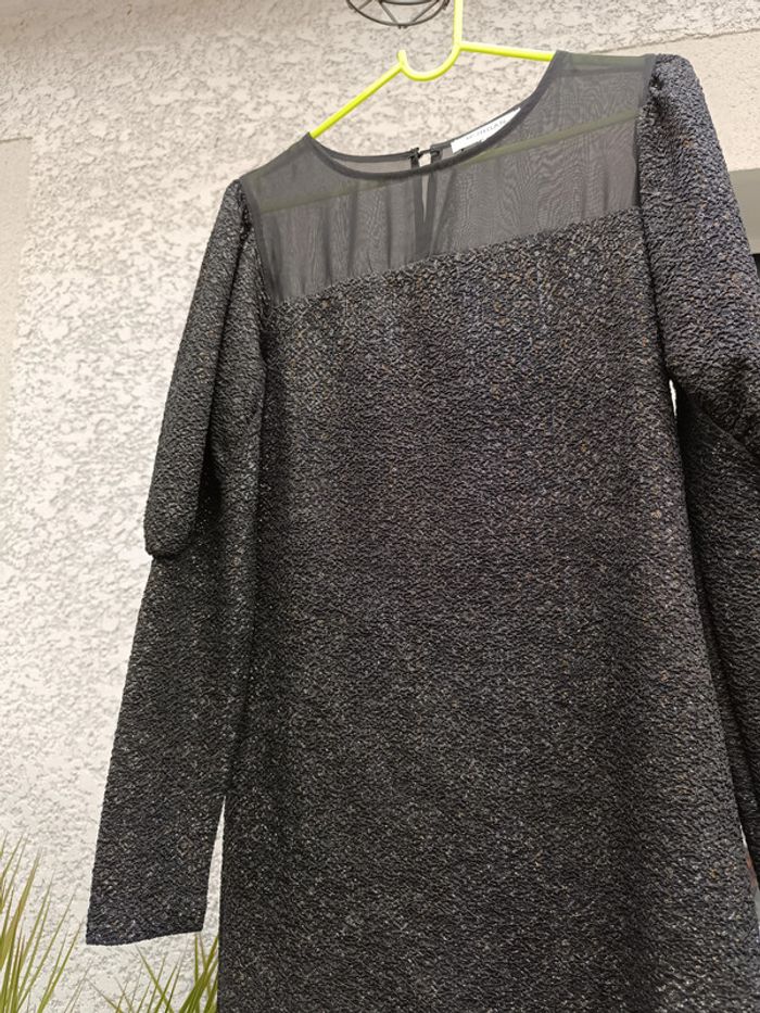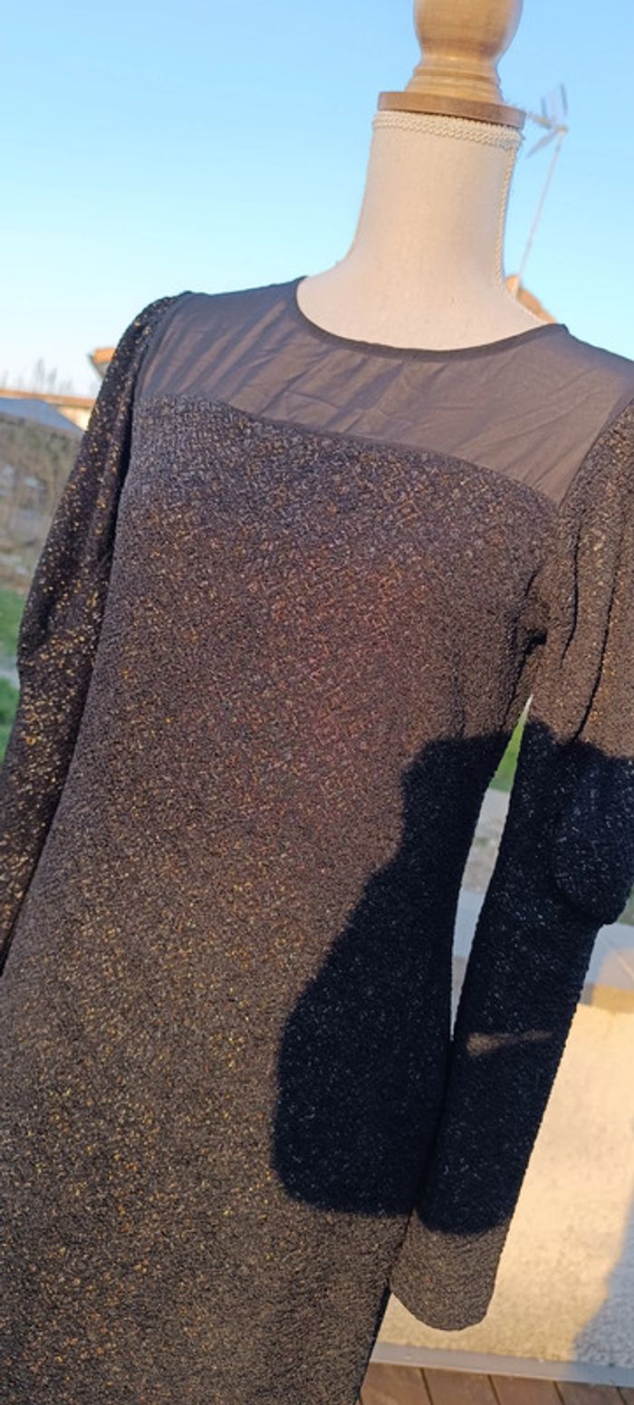 Robe Morgan taille 40 noire et dorée Hyper stretch Fond de robe Manche bouffante serrée aux avant bras Col chic voile transparent #morgan #julieVisfemmeL