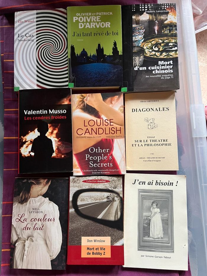 Lot de 9 livres. Je préfères vendre le lot, donc si vraiment un livre vous intéresse, merci de me contacter en privé. #crisprolzaccessoires #livrepatrickpoivredarvor #valentinmussoroman #lacouleurdulait #nellleyshon #lecassonderberg #eliewiesel #donwinslow #lotromans #