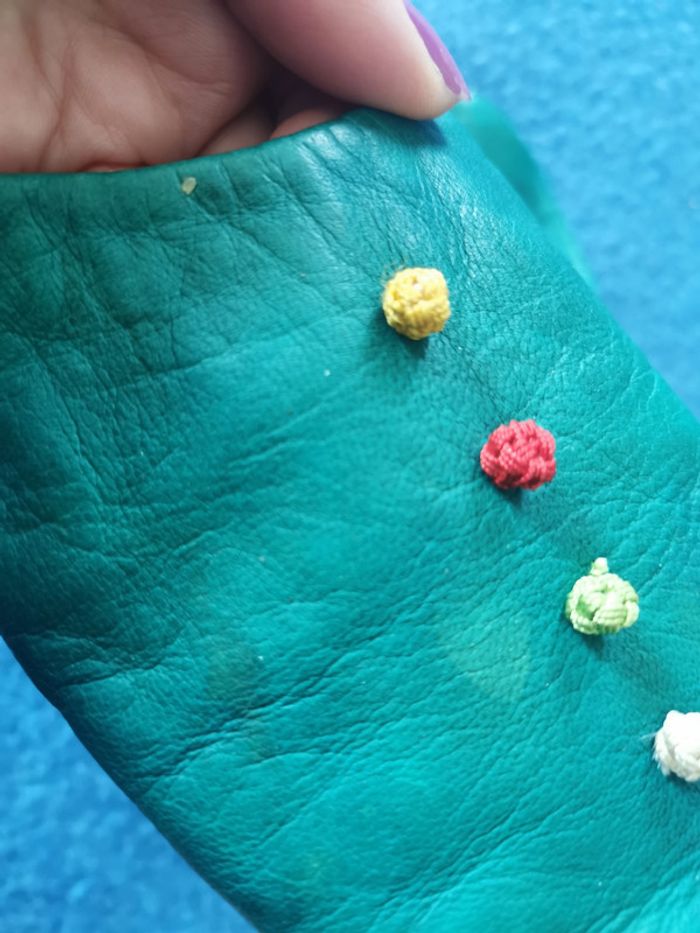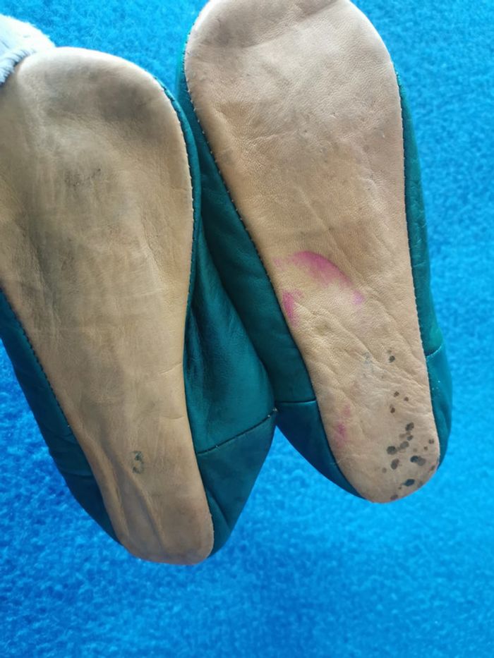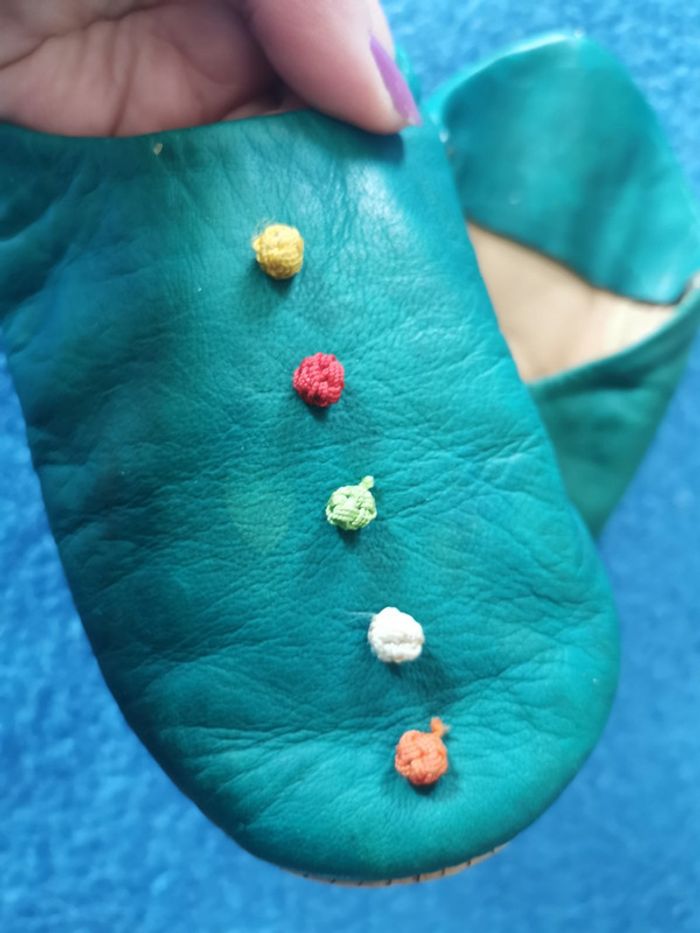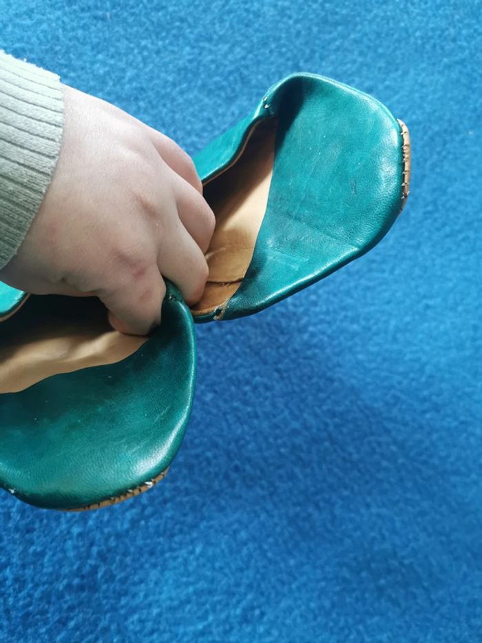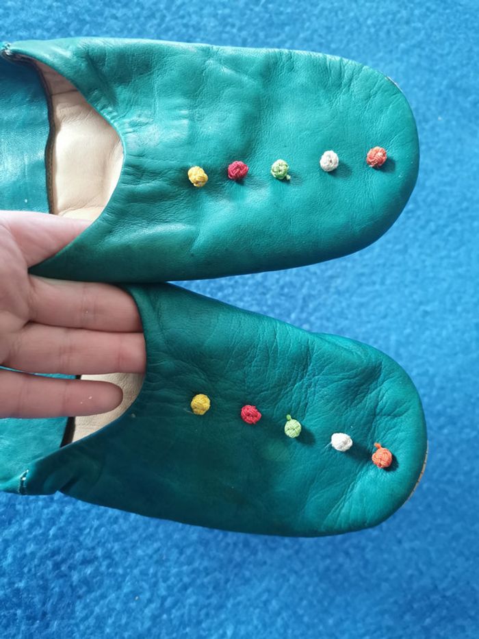 Pantoufles babouches en cuir vert, je pense que c'est du 36, la taille n'est pas indiquée, merci de consulter les dimensions ci-dessous. Ils sont en cuir souple avec des mini-boules en mouliné en décoration, en très bon état général. Dimensions : Longueur semelle : 22,5 cm Largeur semelle : 8 cm Poids : 103g. #pantouflescuir #babouchesvertes #babouchesencuir #pantouflesverts