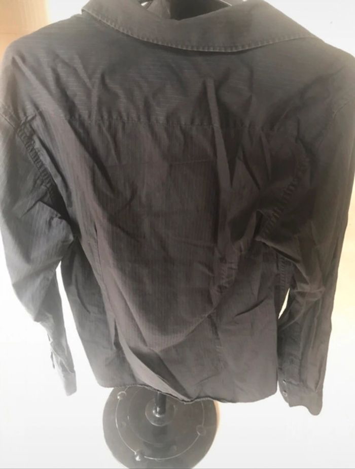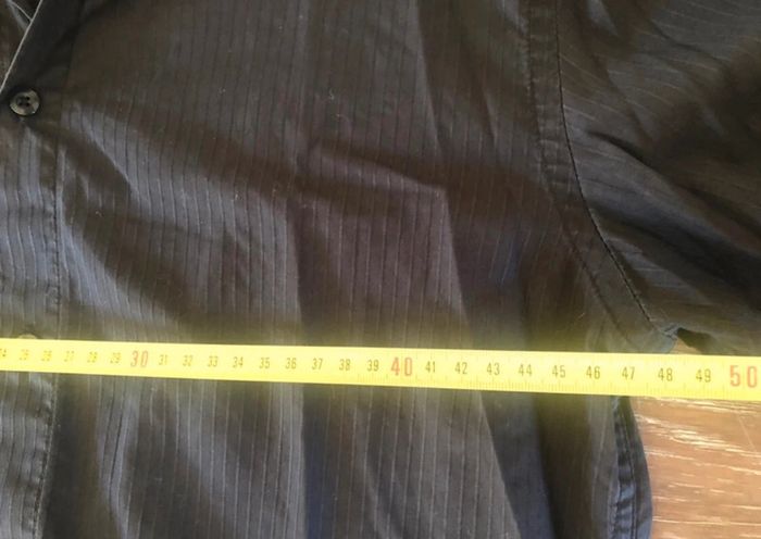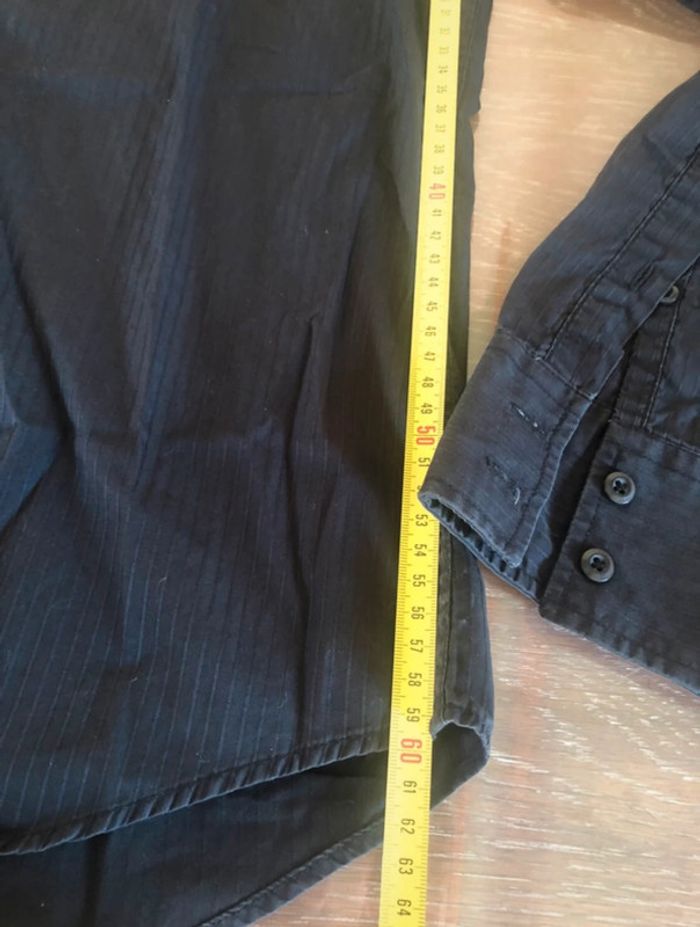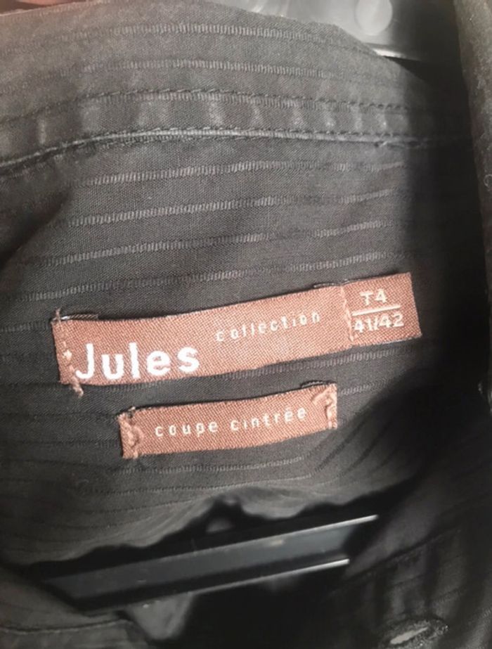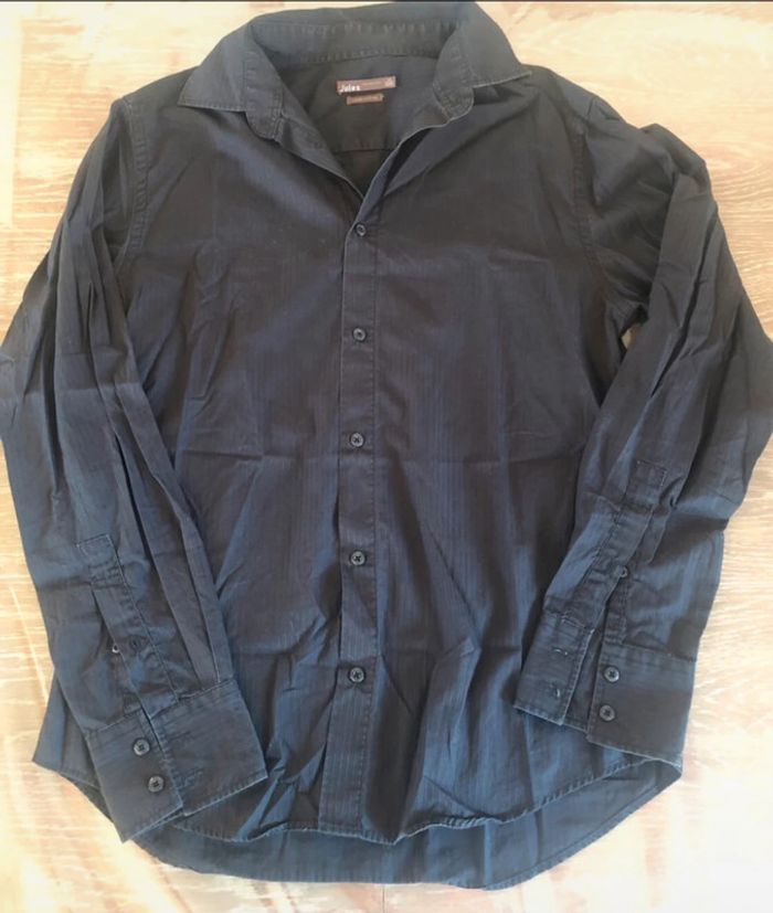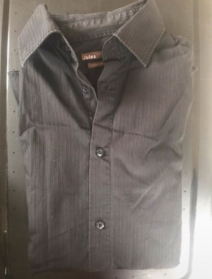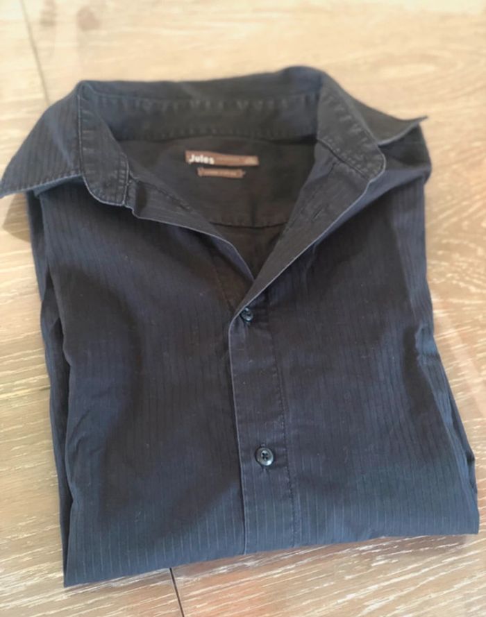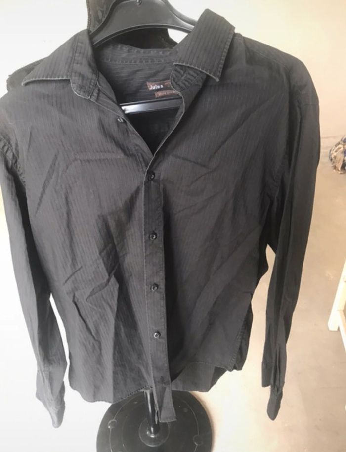 Chemise manches longues taille 4, noire avec de légers liserés gris, en très bon état. Coupe cintré, marque Jules. Mesures en photo. Valeur pour un échange : 2€ de + #crisprolzhomme #crisprolzhaut #chemisejules4142 #chemiserayures #chemisehommexl #