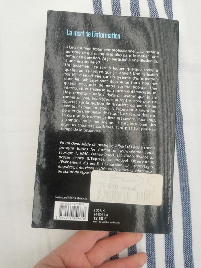 La mort de l'information, livre de Albert du Roy, éd. Stock, 2007, 234p., 296g. Livre au format broché, est en très bon état général, la couvreture est une pliure dans le coin. #lamortdelinformation #albertduroy #stock