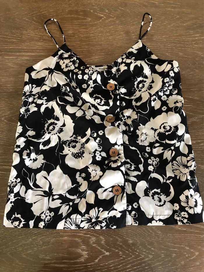 Haut trop mignon, se déboutonne, noir et blanc, marque mango, taille XS. Taille un peu grand c’est a dire un S comme souvent chez mango. 🔄Echange ajouter 3€ au prix. #crisprolzhaut #mangoxs #hautnoiretblancfemme #débardeurfleuri #hautmango36