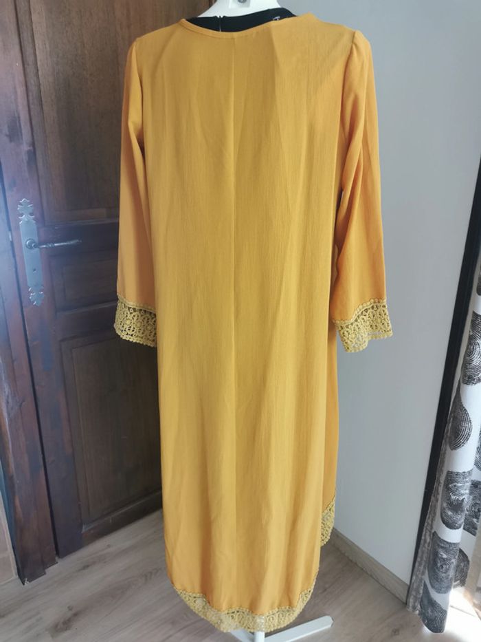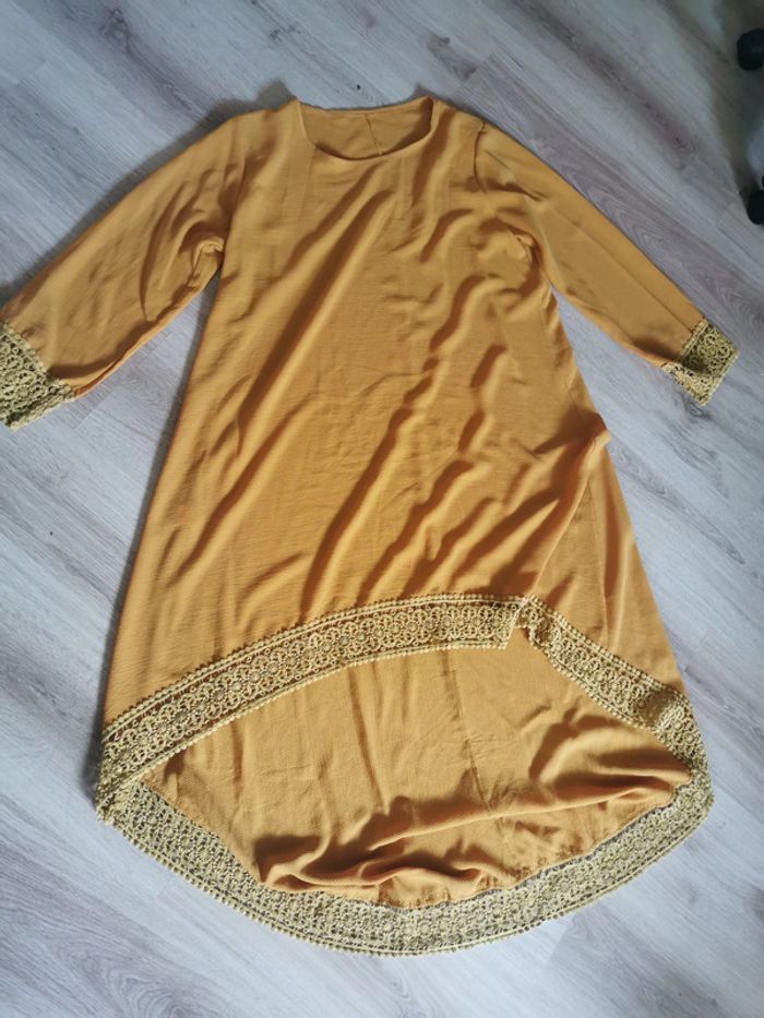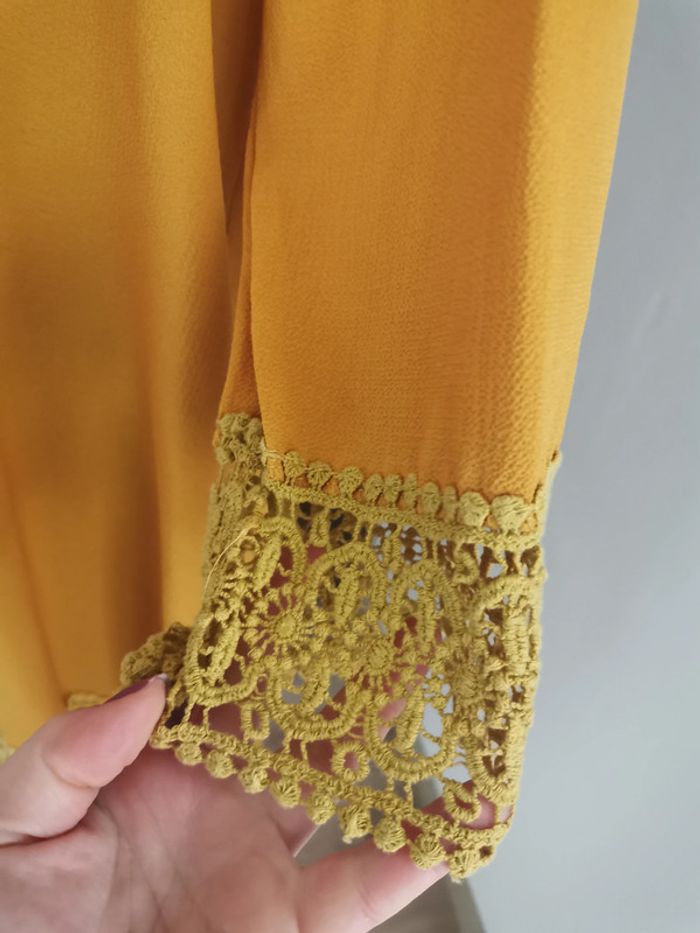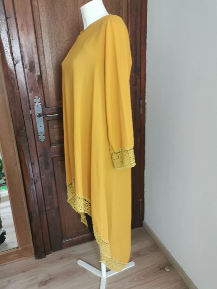 Tunique jaune moutarde manches longues, longueur inégale arrondie, les bords des manches et du bas est en dentelle, l'encolure ronde. Jolie tunique en tissu fluide un peu transparent, la taill et la composition d'étiquette est absente. Mannequin fait taille 36. Veuillez consulter les mesures ci-dessous avant de faire votre achat. Mesures : Longueur : 139 et 80 cm Longueur manche depuis l'épaule : 59 cm Longueur manche depuis l'aisselle : 44 cm Largeur des épaules : 41 cm Largeur dos entre les aisselles : 57 cm Poids : 242g #tuniquejaune #tuniquejaunemoutarde #tuniquedentelle #tuniquemancheslongues