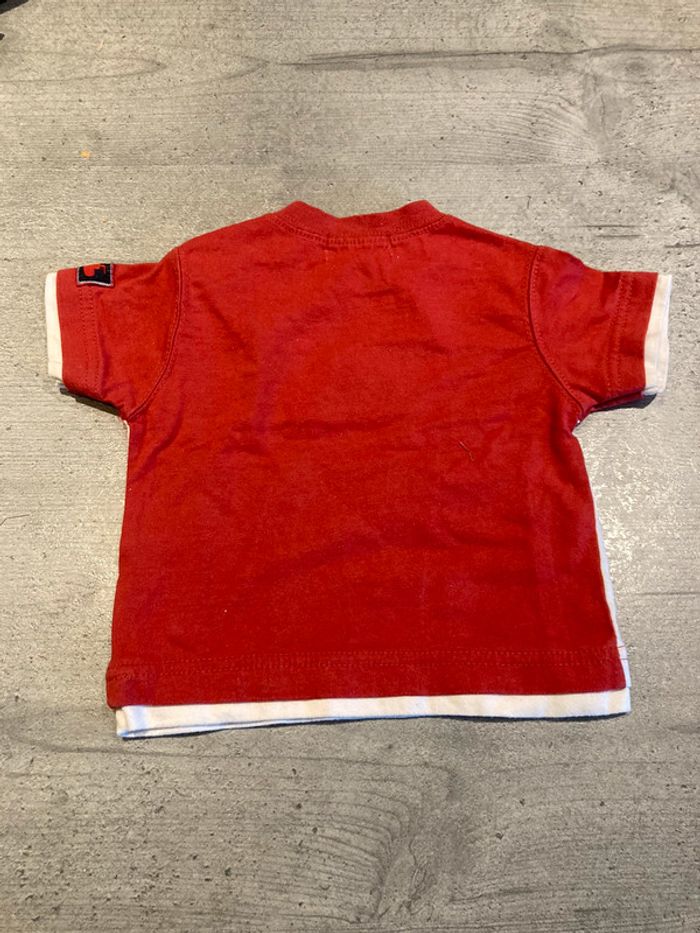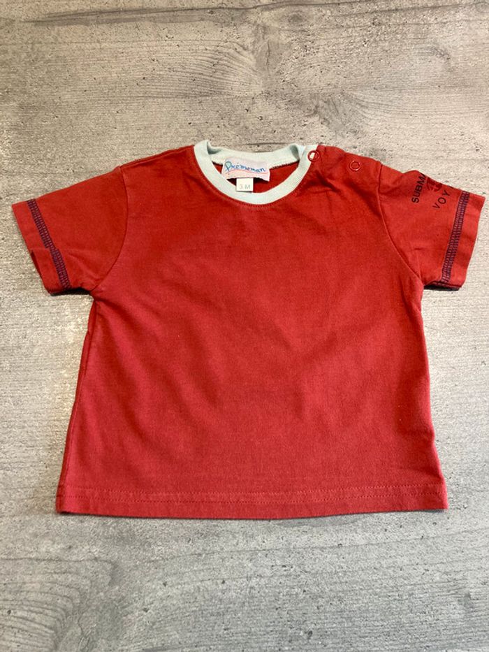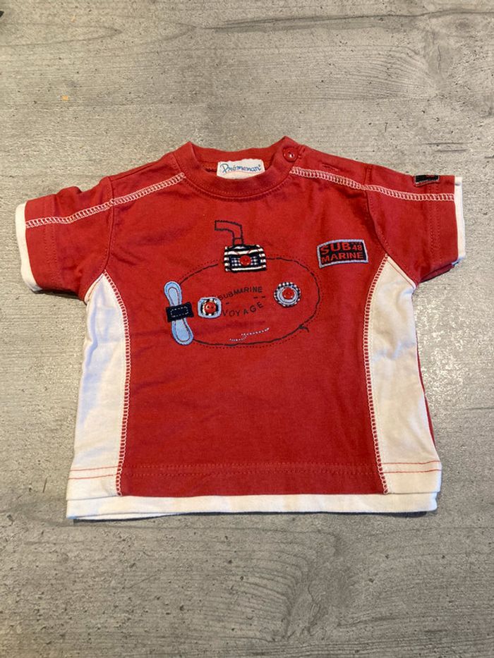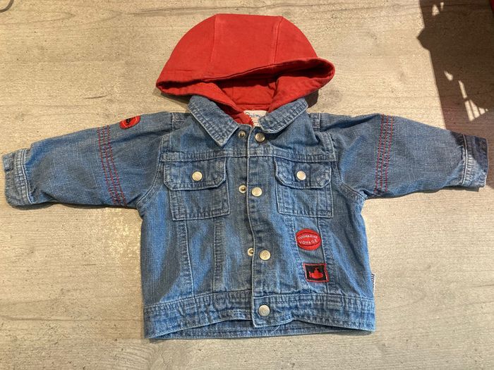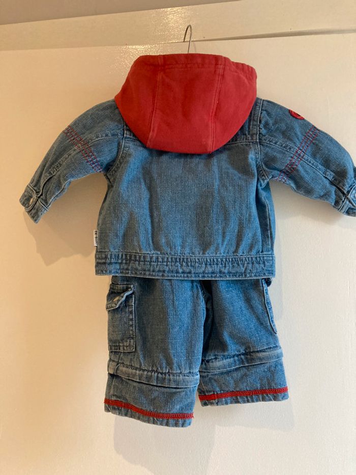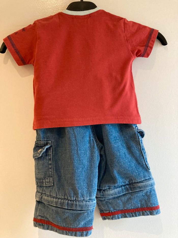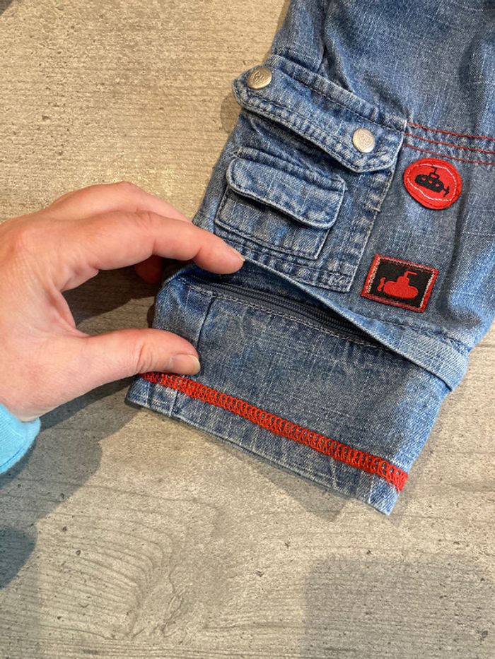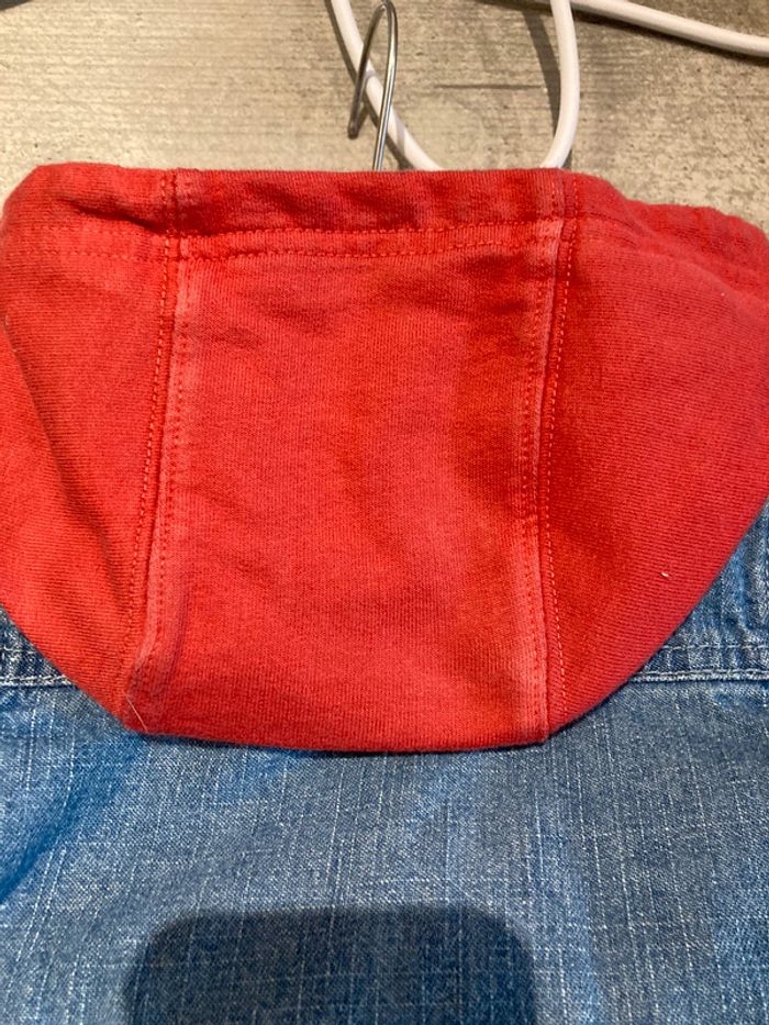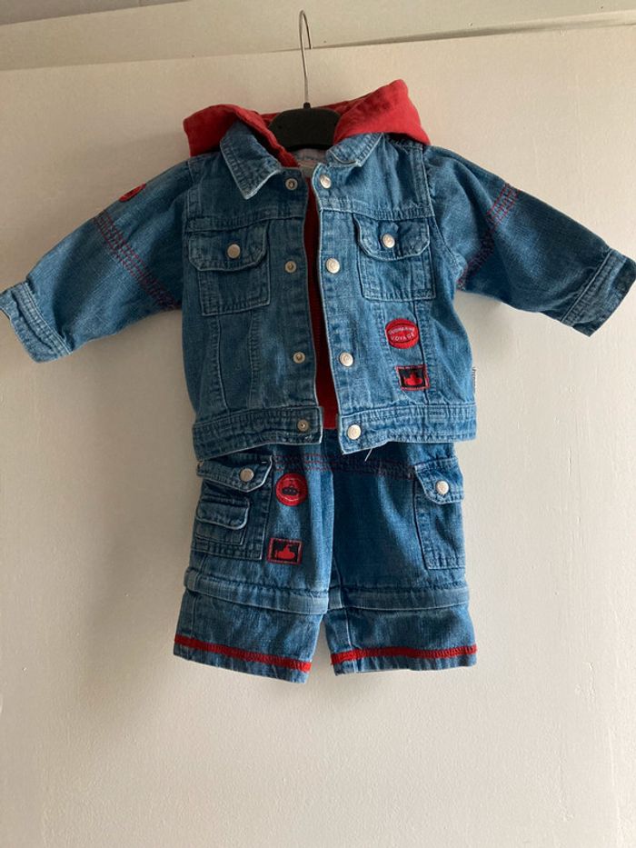ensemble 2 tee-shirts , pantalon transformable en 3/4 et veste en jeans quelques traces d’ usure au niveau de la capuche et jambes ( voir photos) . le rouge est un peu moins vif que sur les photos