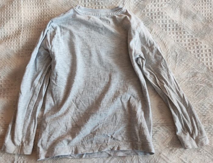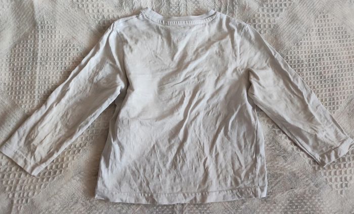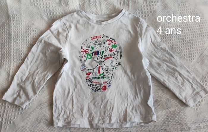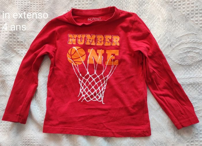 Lot de 4 t-shirts manches longues et 1 t-shirt manches courtes avec chemise en bon état taille 4 ans. T-shirt Donald dessin un peu craquelé et celui tête de mort une petite tâche. Petite tâche sur t-shirt manches courtes. Réductions activées à partir de 2 articles achetés