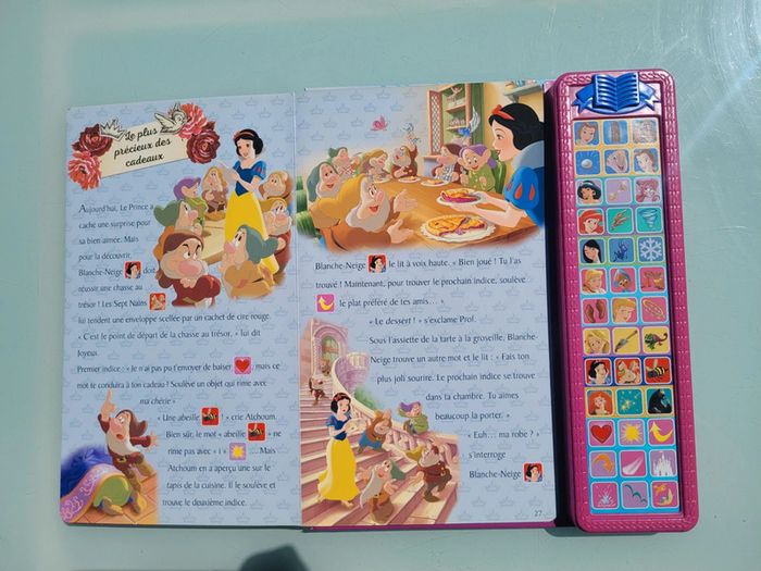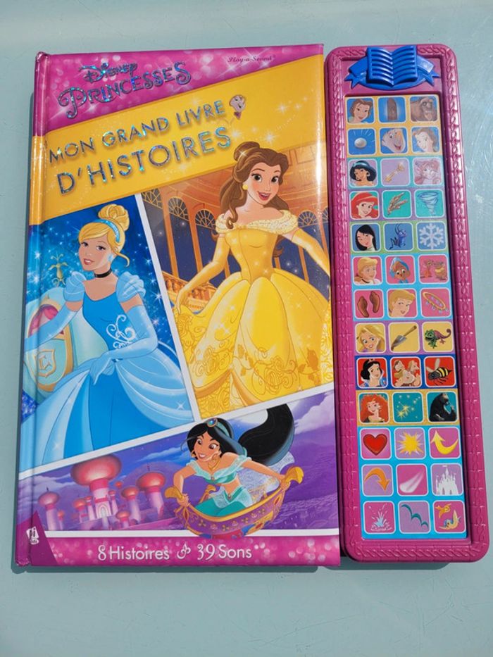 DISNEY PRINCESSES MON GRAND LIVRE D'HISTOIRES 8 HISTOIRES ET 39 SONS Rejoins tes princesses Disney préférées et participe à leurs aventures enchantées ! Donne vie aux histoires en pressant les boutons au fil de ta lecture ! 8 histoires de princesses 39 sons pour enrichir l'histoire avec les voix des princesses, des musiques et des sons joyeux ! Format : 28 x 33 Un coin abîmé sinon en très bon état, les 39 sons fonctionnent Mes autres livres sonores : #livresonoremooglou Mes autres livres enfants : #livreenfantmooglou