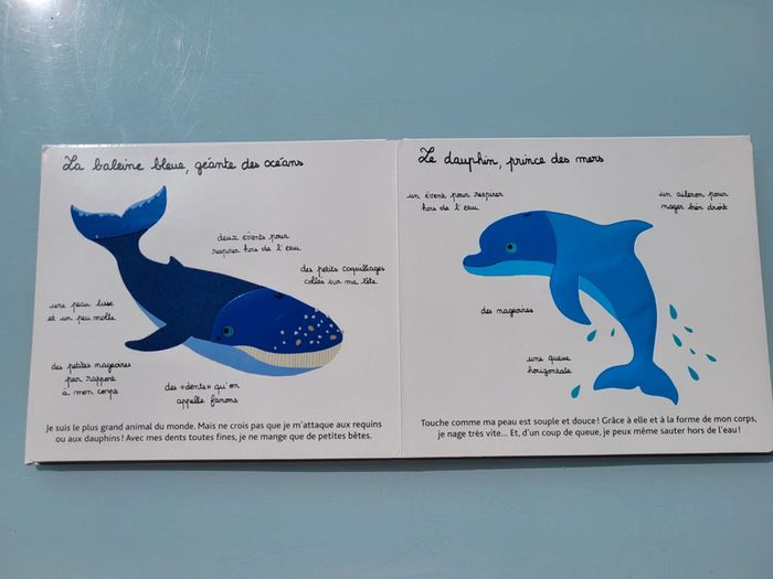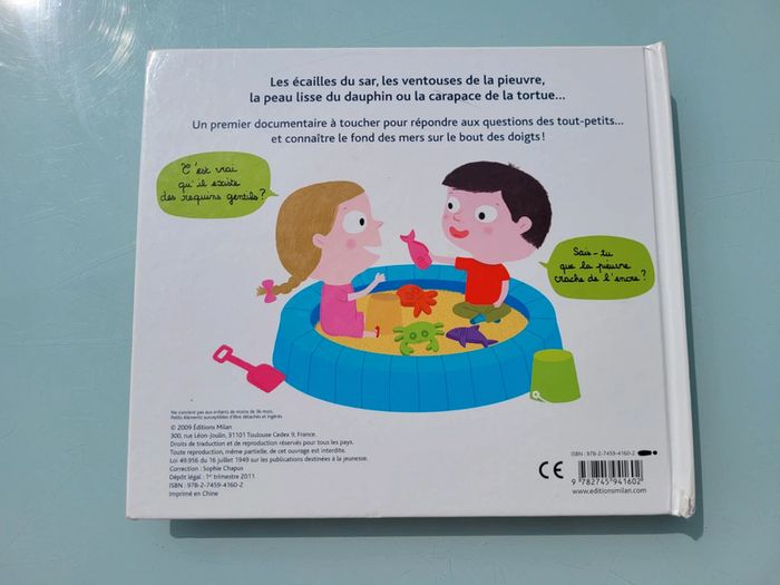 MES ANIMAUX DES MERS À TOUCHER MILAN JEUNESSE Ici, l'enfant est invité à découvrir par le toucher à quoi ressemble chaque animal marin, mais aussi à comprendre son comportement, à connaître son alimentation À chaque double page, un animal est mis en valeur et l'enfant est invité à en toucher une partie. À côté, des vignettes documentaires apportent des informations simples et amusantes, parfaitement adaptées à la tranche d'âge. Un traité illustratif très fiction, de petites infos courtes et précises, de larges surfaces de matière à toucher Ici, c'est l'interactivité qui devient source de découverte et de dialogue pour les enfants. 2 coins abîmés, bien manipulé mais en bon voir très bon état général Mes autres livres à toucher : #livreatouchermooglou Mes autres livres enfants : #livreenfantmooglou
