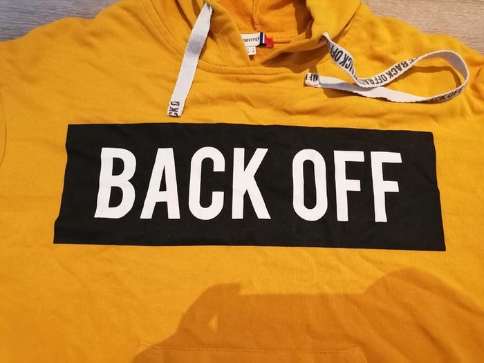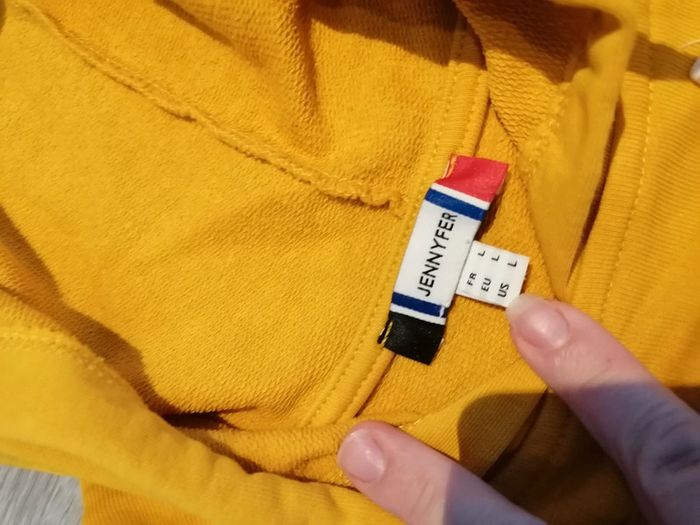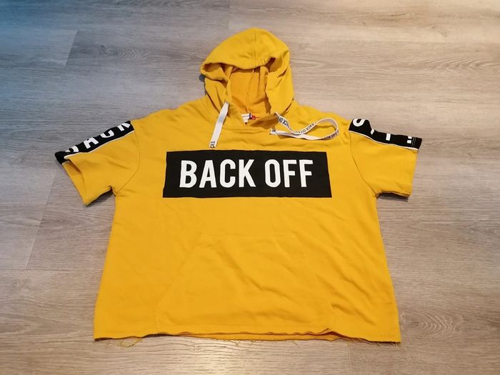 Bonjour, je vends ce crop top à manches courtes à capuche jaune avec écritures noires et blanches de la marque Jennyfer taille L en très bon état. Lavé maison non fumeur.
