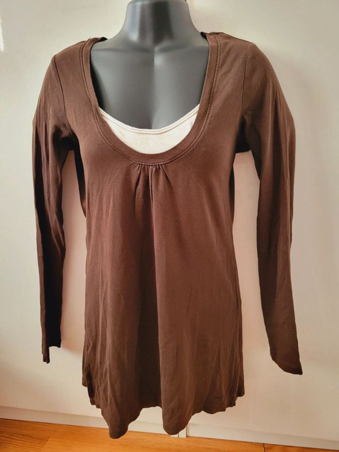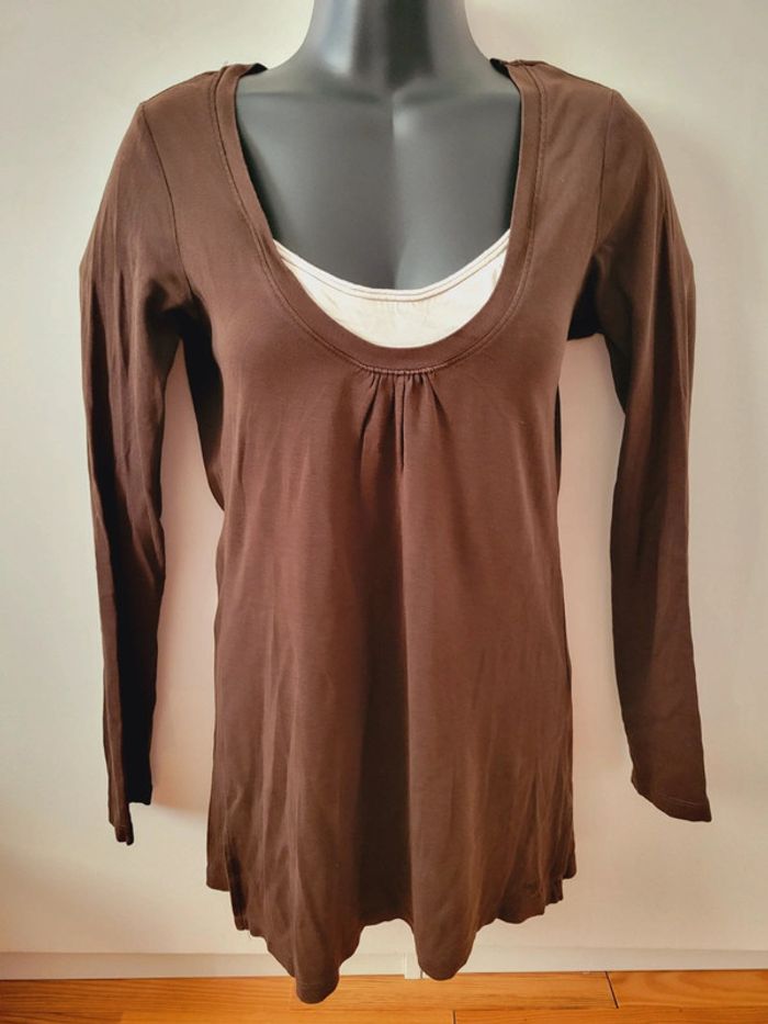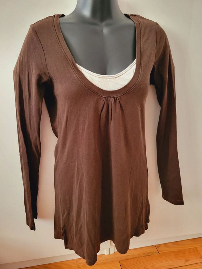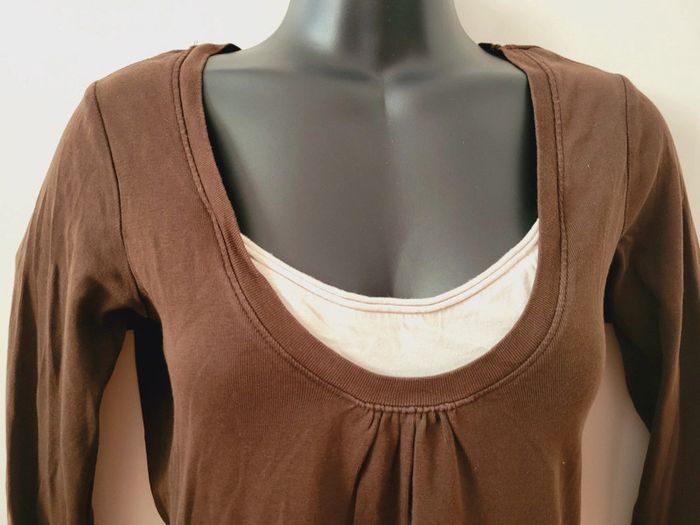 Haut Top tee shirt marron blanc coquette manches longues taille M 38 en 100% coton - photo numéro 4