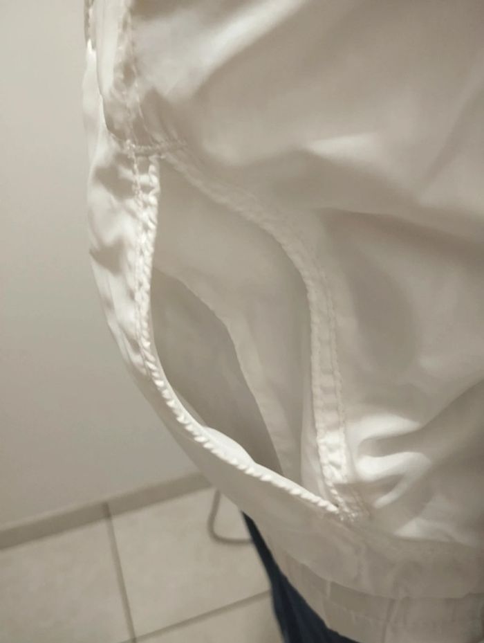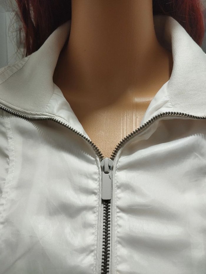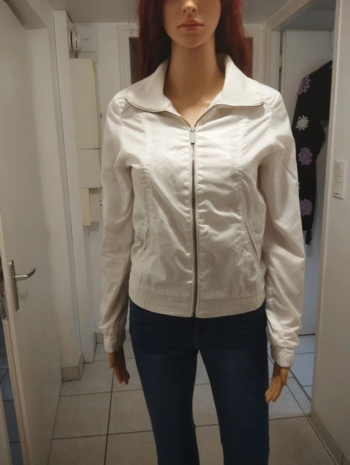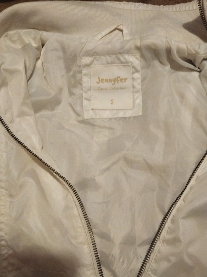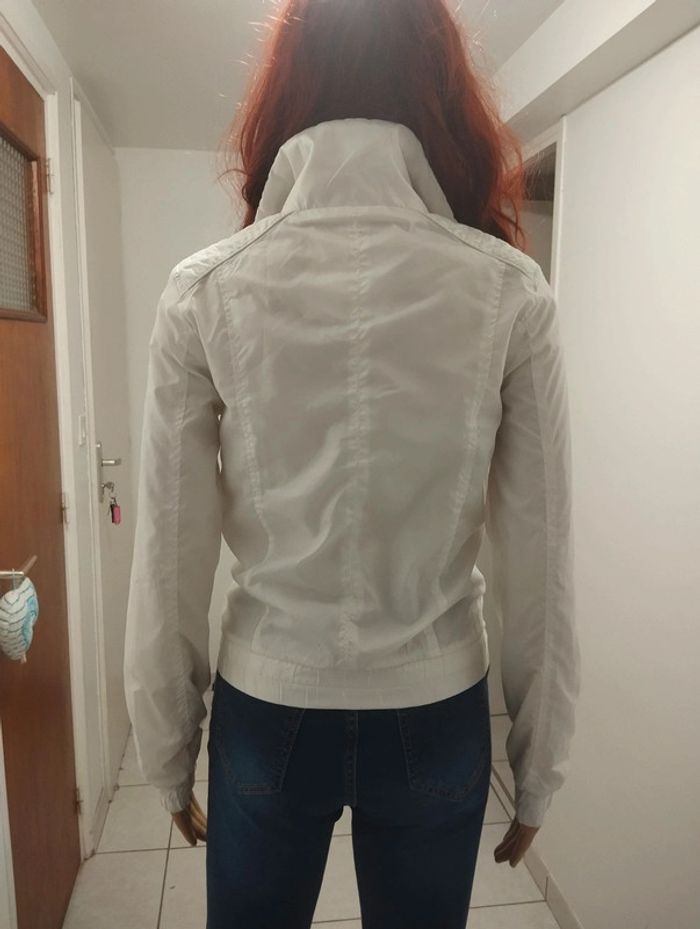 ℹ️ Veste de couleur blanc cassé. Se ferme grâce à une fermeture éclair. Elle possède deux poches. Idéal pour la mi saison car assez légère mais protège bien grâce à son col montant. Il y a une doublure à l'intérieur. Les épaules ont un effet matelassé. La taille et le bout des manches est un peu plus resserré et légèrement élastique. 🧵 100% polyester 📏 Largeur épaules: 38cm Aisselle à aisselle: 45cm Largeur taille: 43cm Longueur totale: 54cm J