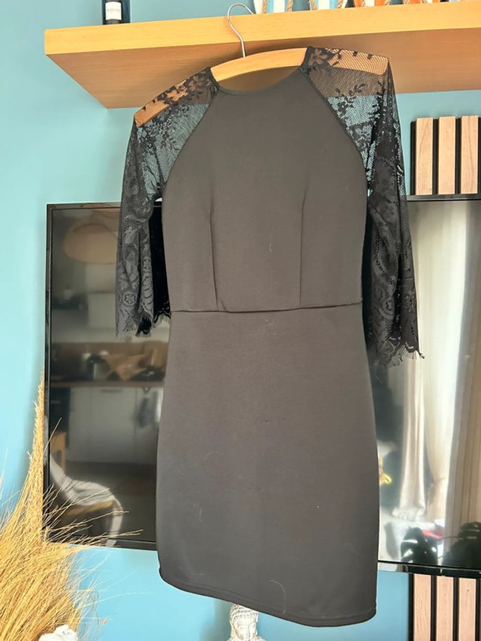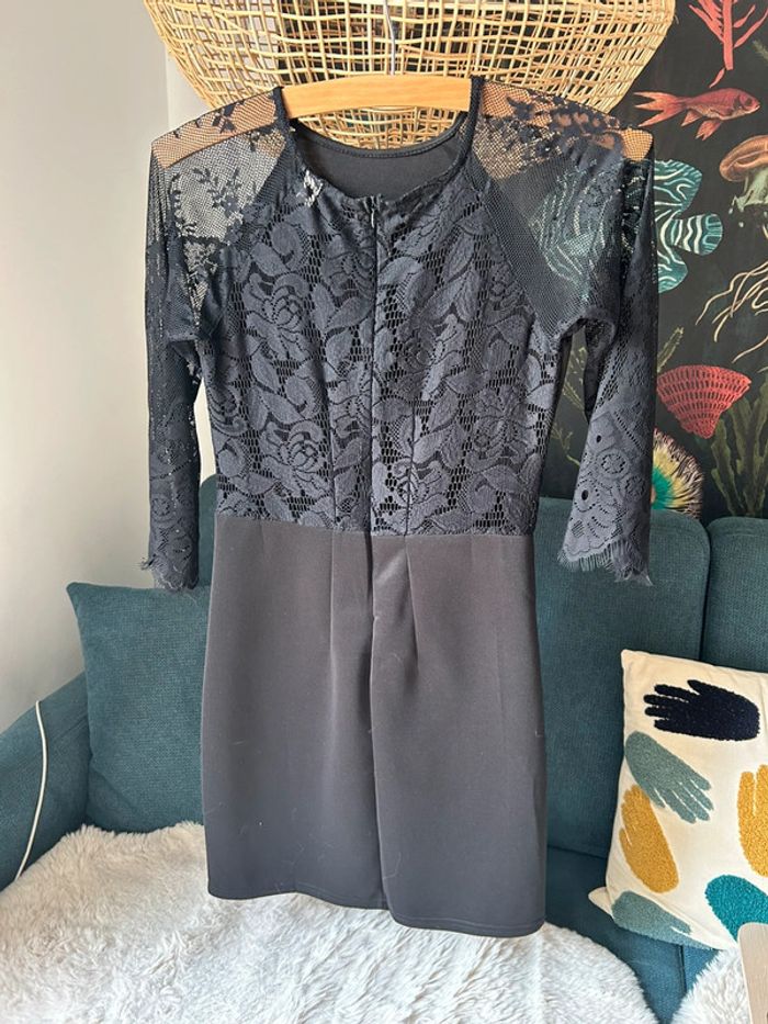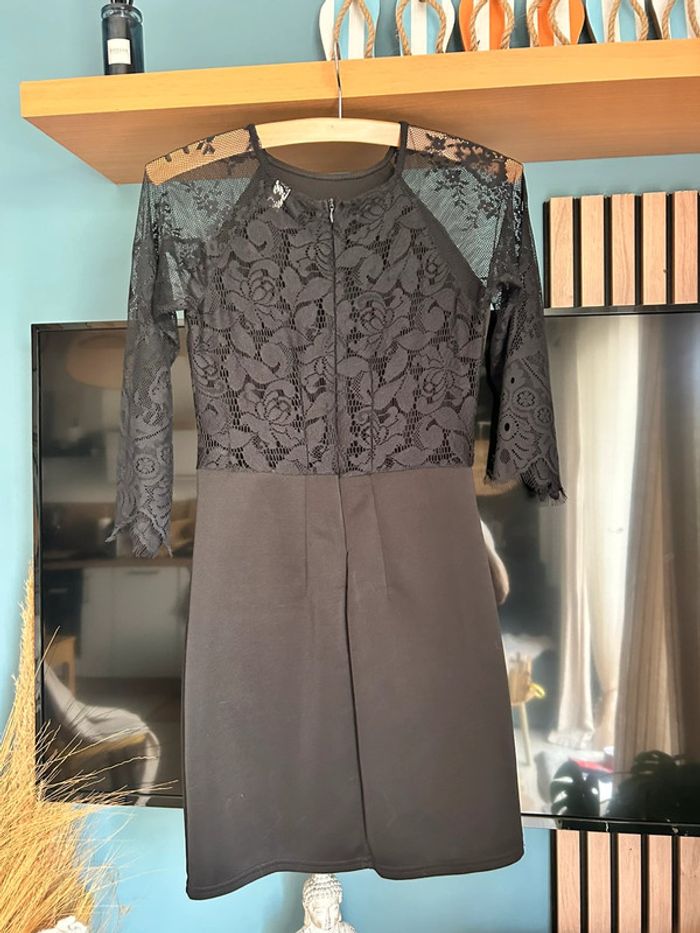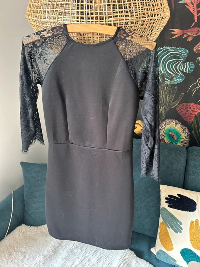 Magnifique pièce très chic et élégante cette petite robe noire courte fera sensation pour vos soirées habillées. portée une seule fois, état impeccable. Jolie dentelle dos transparent et Zip arrière. Matière très légèrement élastique. Dimensions : aisselles à aisselles =38cm longueur totale depuis l'épaule= 82cm