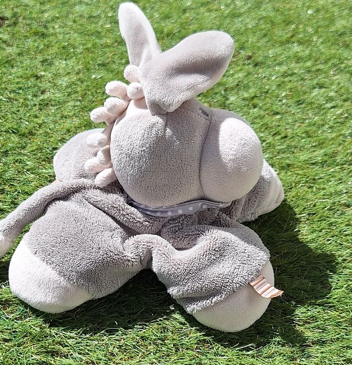 Peluche âne NATTOU cappuccino gris de la Marque NATTOU Doudou âne gris semi plat avec un foulard à pois autour du cou et la peluche a les coins blancs Micro billes dans les pattes Coloris : gris et blanc Dimension : environ 20 cm Les yeux et les narines de l'âne sont brodés au fil gris Etat Parfait !