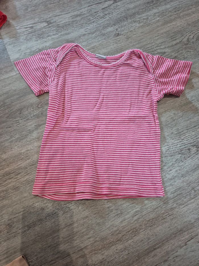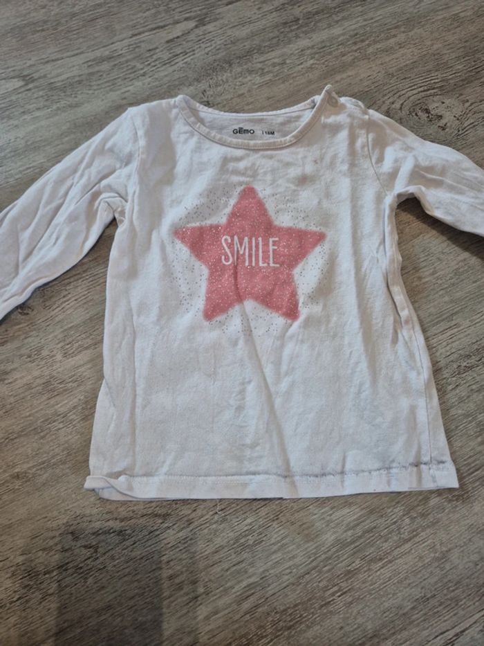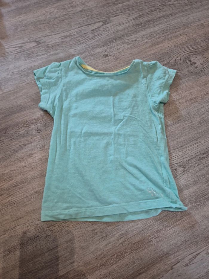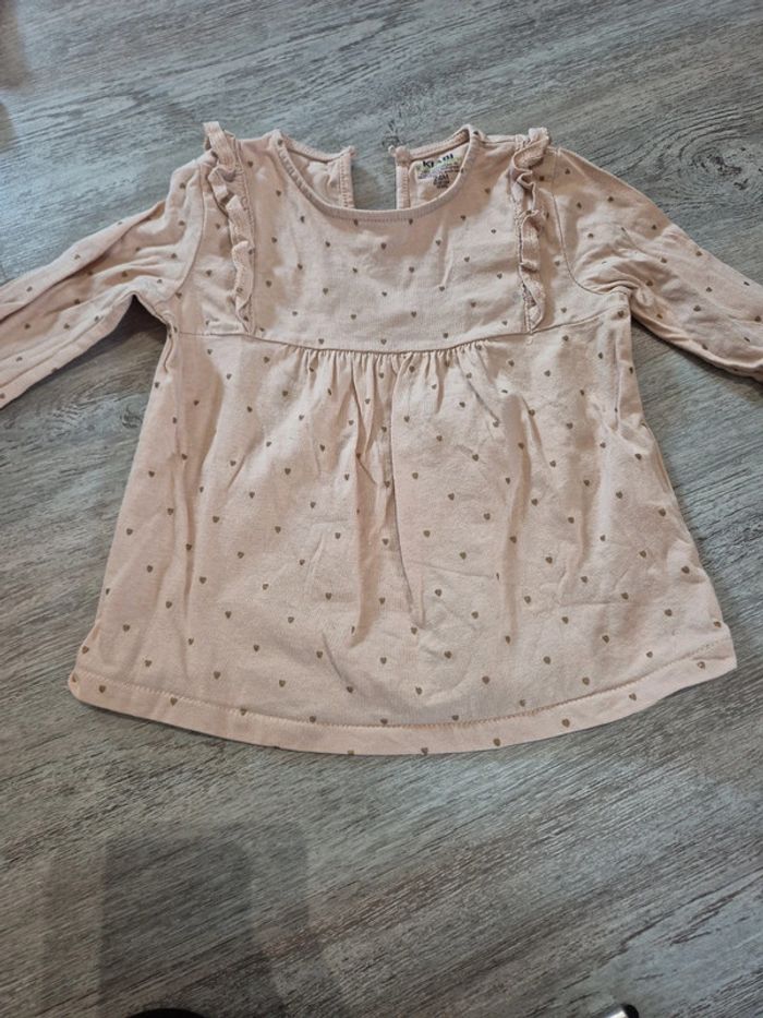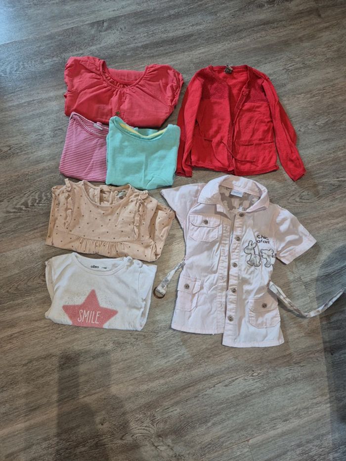 Lot de vêtements comprenant : Chemise manches courtes 23 m Tee shirt manches longues blanc gemo 18 m Tee shirt beige manches longues coeur doré à paillettes kiabi 24 m Tee shirt vert orchestra 2 ans Tee shirt rayé tout simplement 2 ans Gilet état satisfaisant TAO 23 m Robe