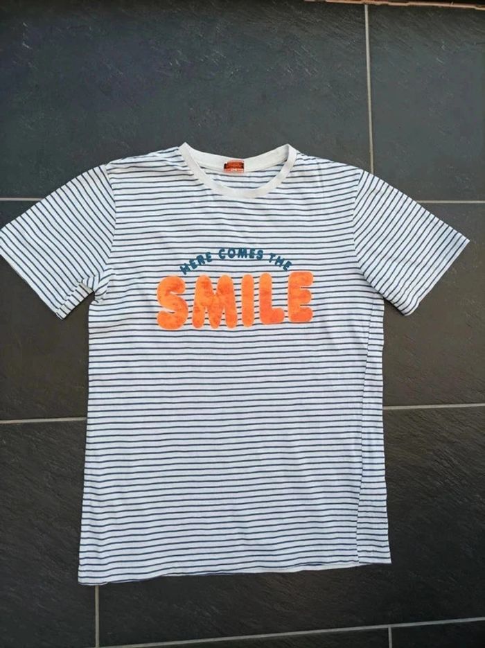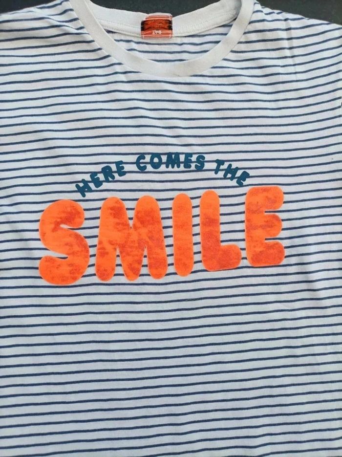 Vends ce très beau tee-shirt pour garçon de 14 ans (164 cm). Rayé. Écriture "smile" originale. Excellent état : aucun trou, aucune tache. #titiya76garçon #titiya7614ans #titiya76teeshirtgarcon14ans #titiya76garcon14ans