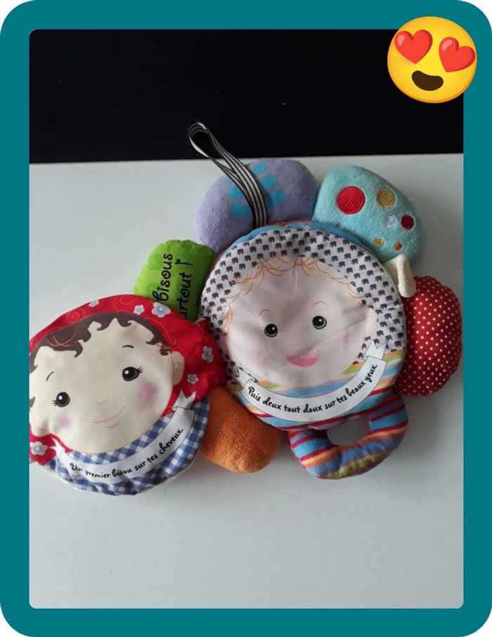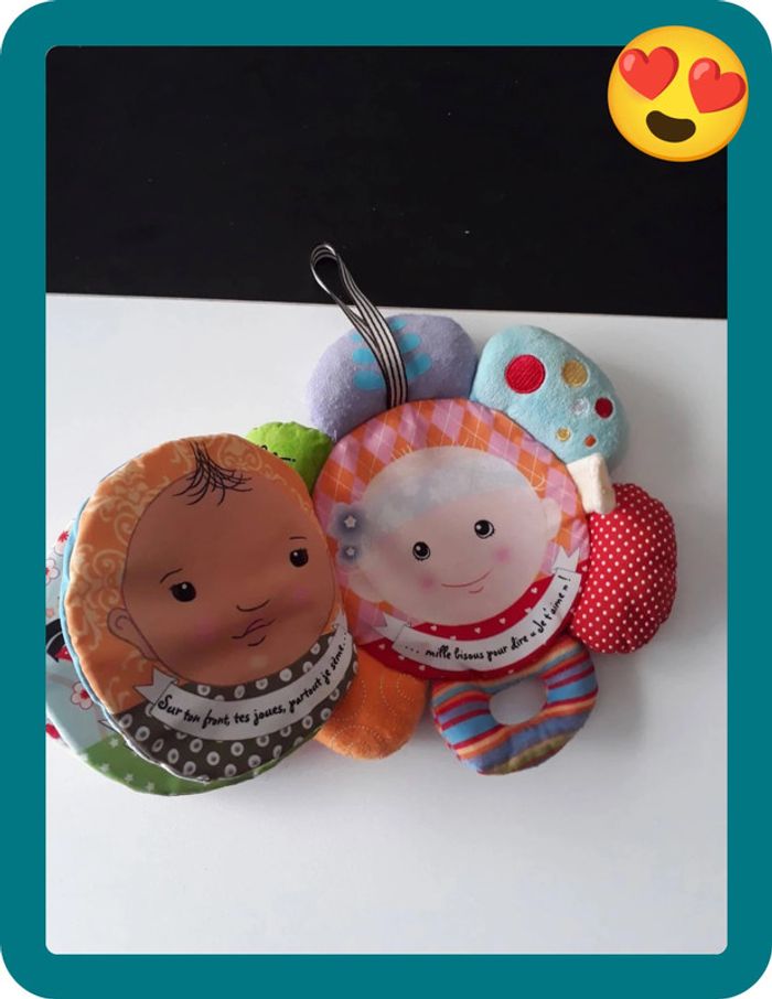 🌼Livre en tissu "des bisous partout", doux et moelleux au toucher, lavable, s'accroche facilemnt, colorées,effet sonore, en très bon état #mayelivreetdivers