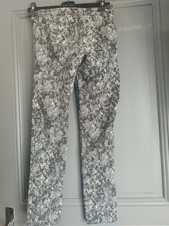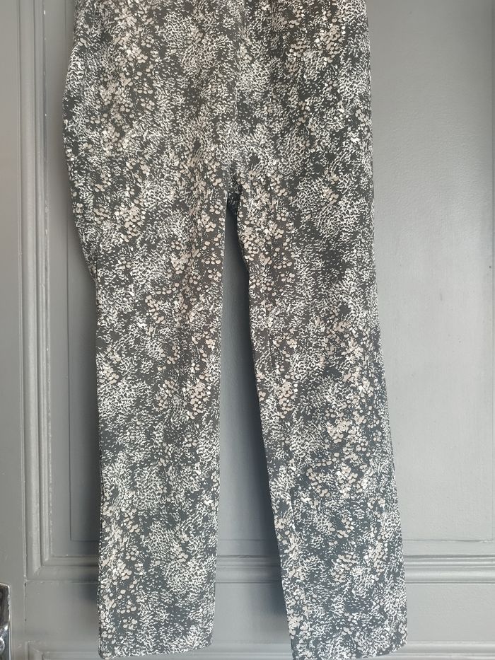 Vends pantalon marque Zara, taille S coloris noir tacheté kaki et crème, 2 poches zippées, taille basse, excellent état,