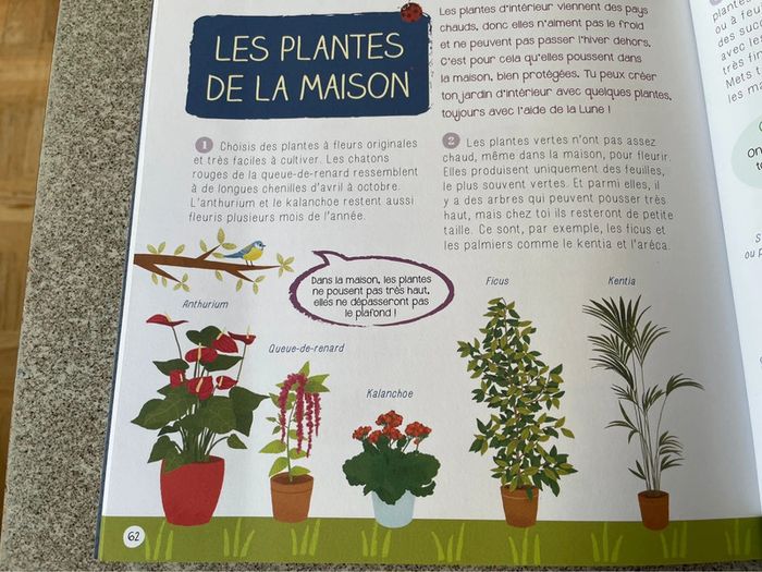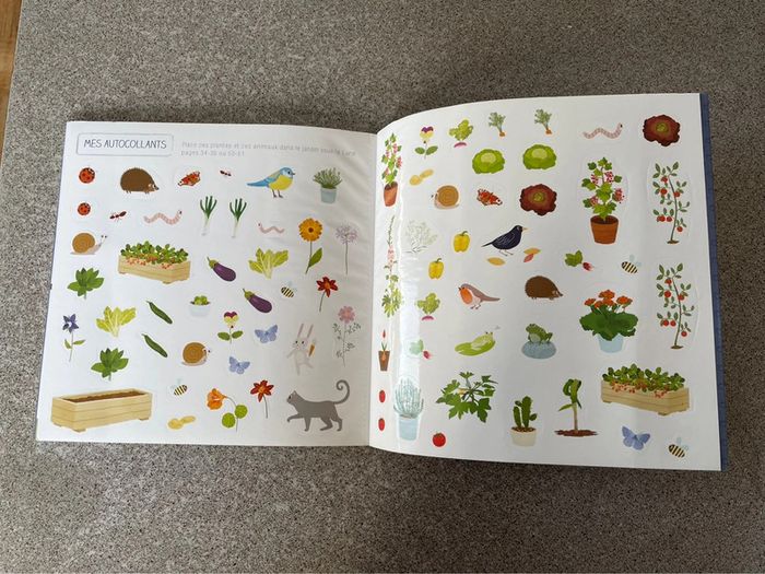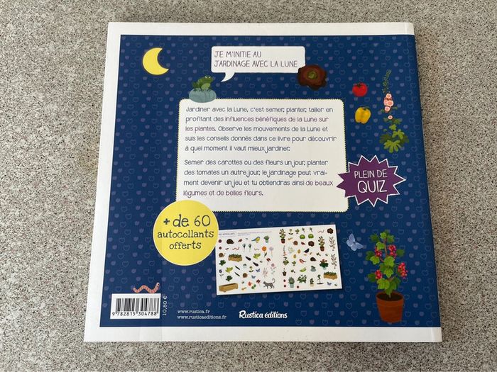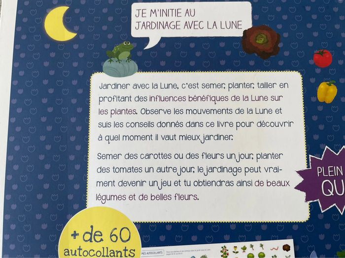 Livre Je jardine avec la lune Graine de jardinier 63 pages pour découvrir le jardinage les plantes qui se mangent..voir le sommaire ( les deux dernières photos) Plein de Quizz Plus de 60 autocollants offerts