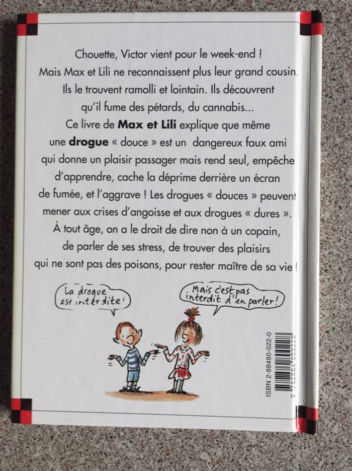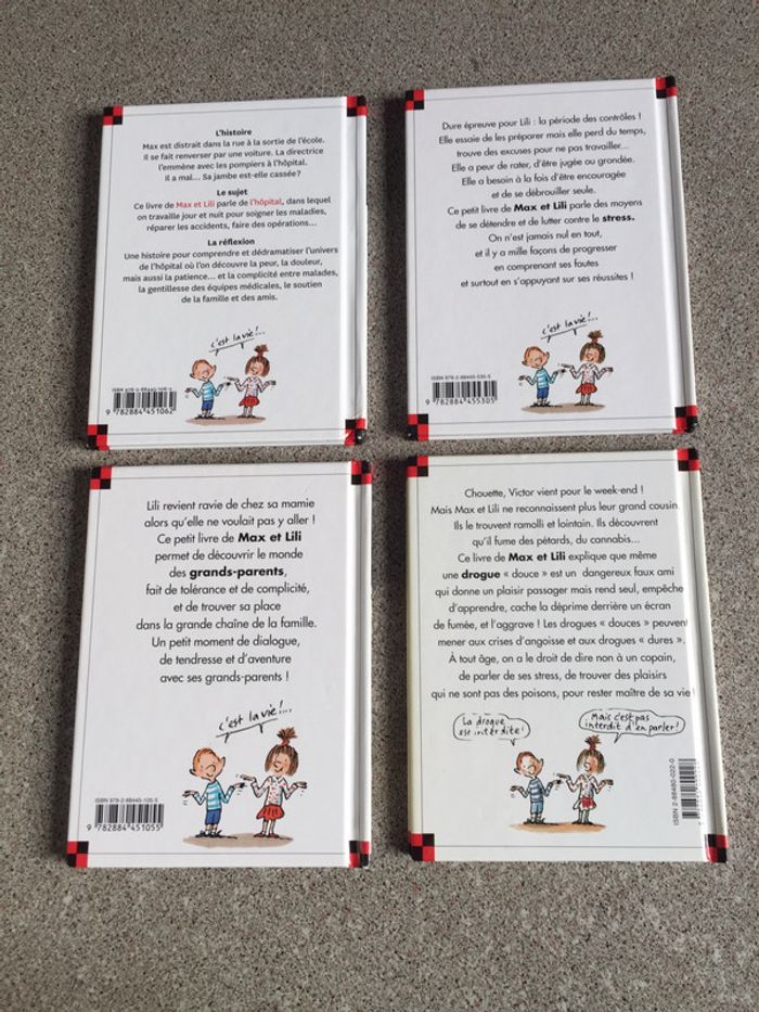 4 Livres Lili et Max comme Neufs Lili a peur des contrôles Lili découvre sa mamie Le cousin de Max et Lili se drogue Max va à l’hôpital Vous trouverez le résumé en photo de chaque livre Des livres très bien écrits avec des mots pour expliquer les choses de la vie Pas toujours facile pour les adultes de trouver les mots J’ai d’autres titres dans ma boutique