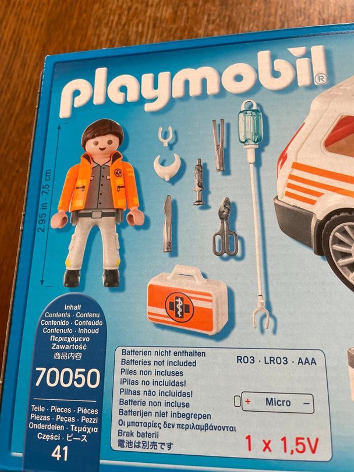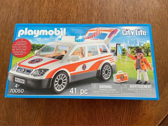 Boîte playmobil City Life 70050 Neuve Boîte jamais ouverte avec encore les scellés À partir de 4 ans Voiture et ambulancier et équipement pour médecin urgentiste Avec girophare effets lumineux et sonores ( piles non fournies) La banquette arrière est rabattable ) D’autres playmobil dans ma boutique