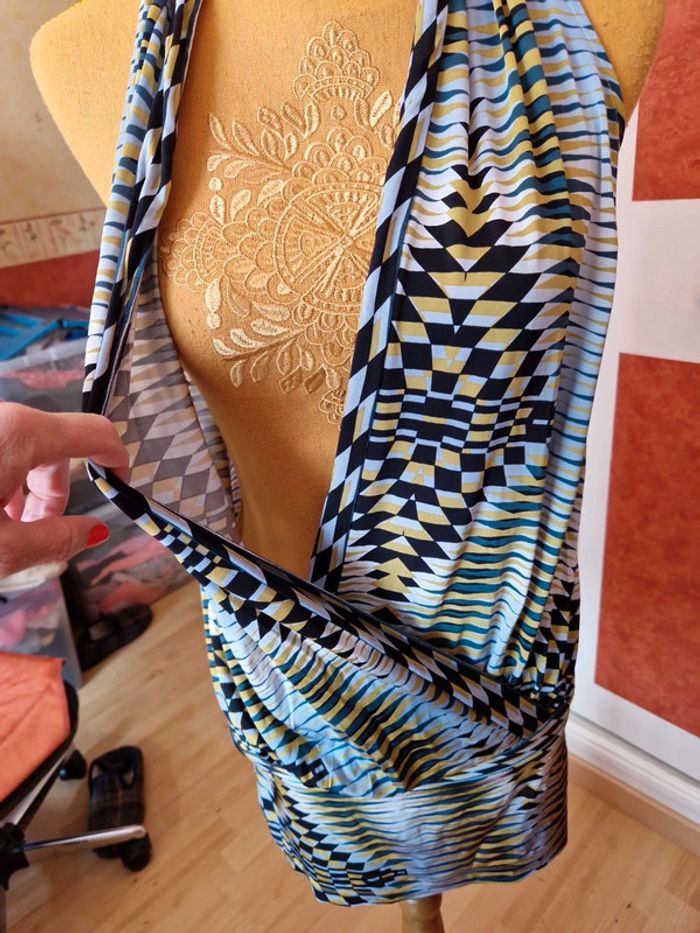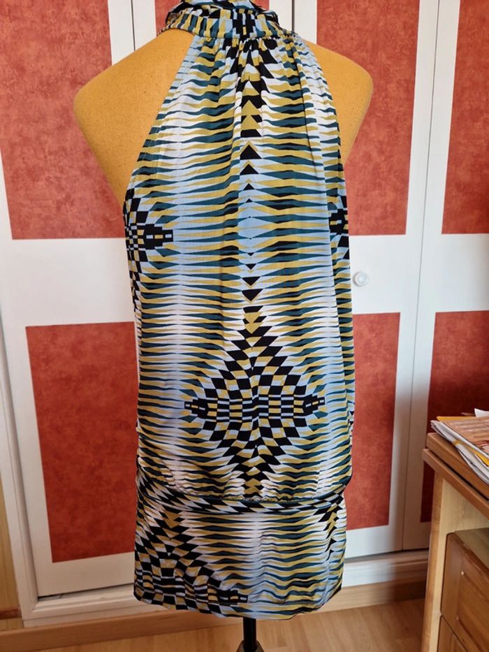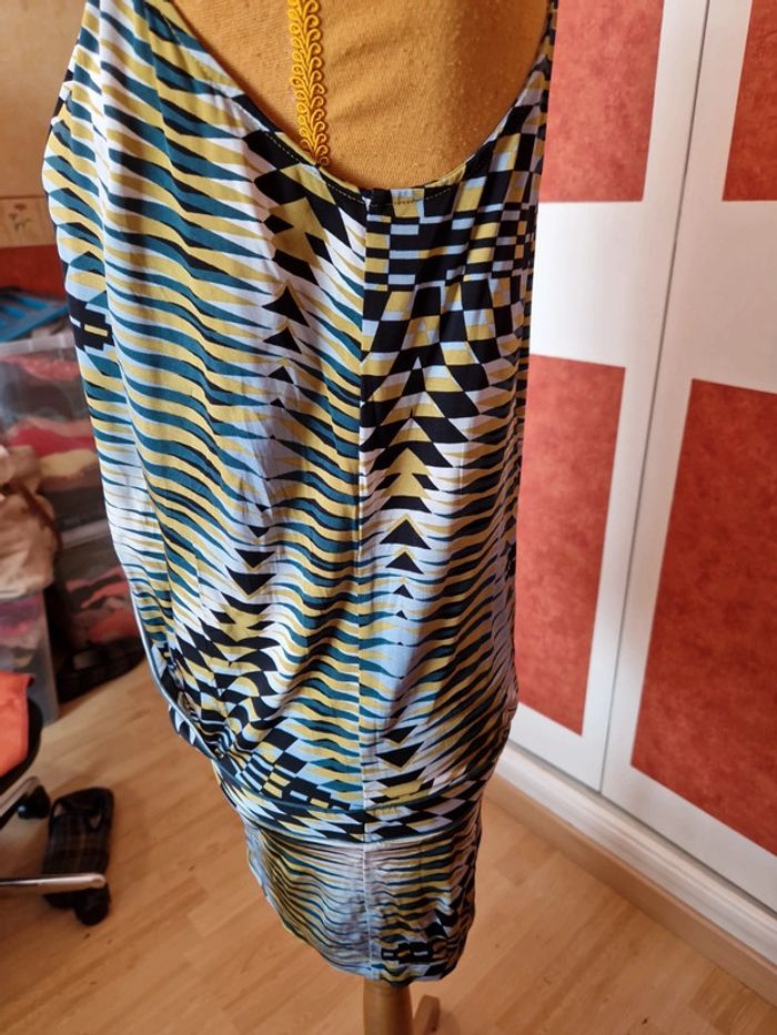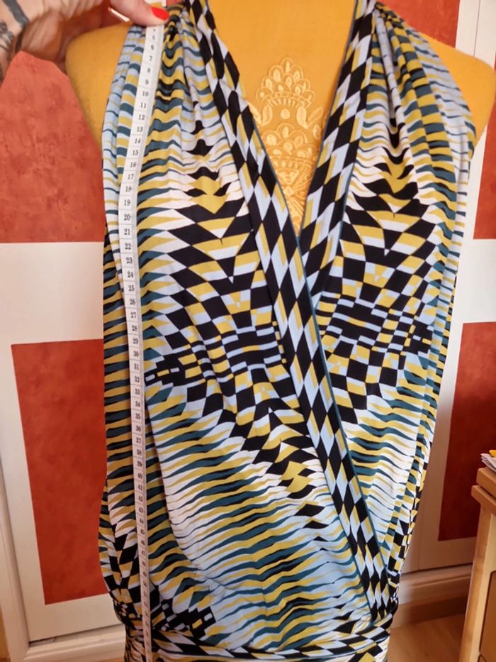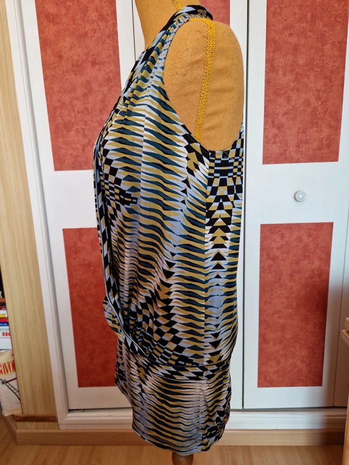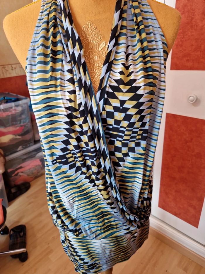 Robe très courte ou tunique à voir. Mesures en photo. Devant décolleté très plongeant sans fermeture. Sans manches.