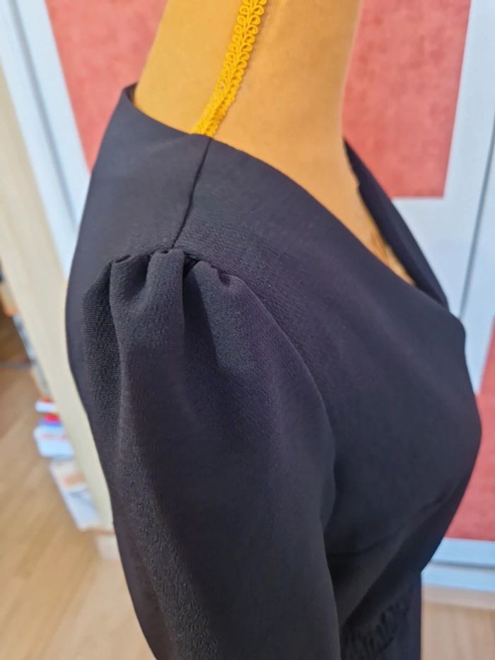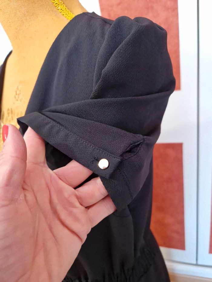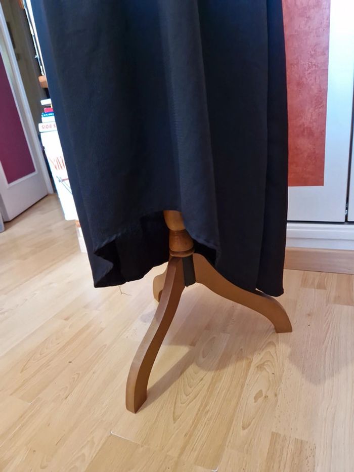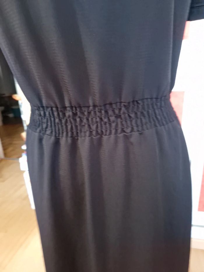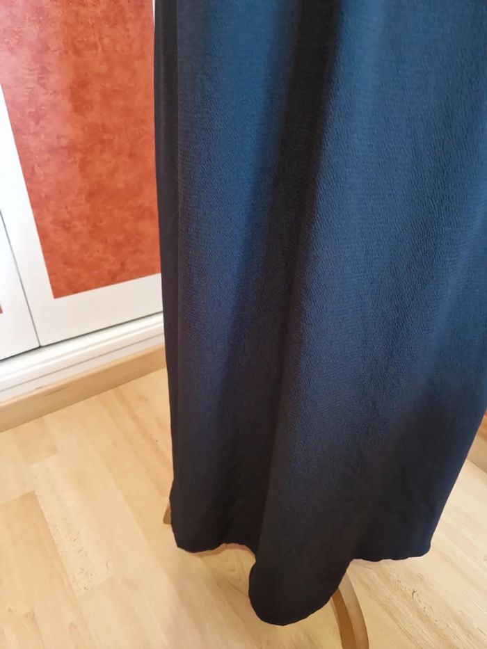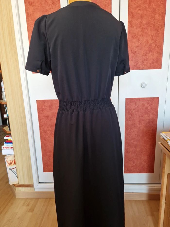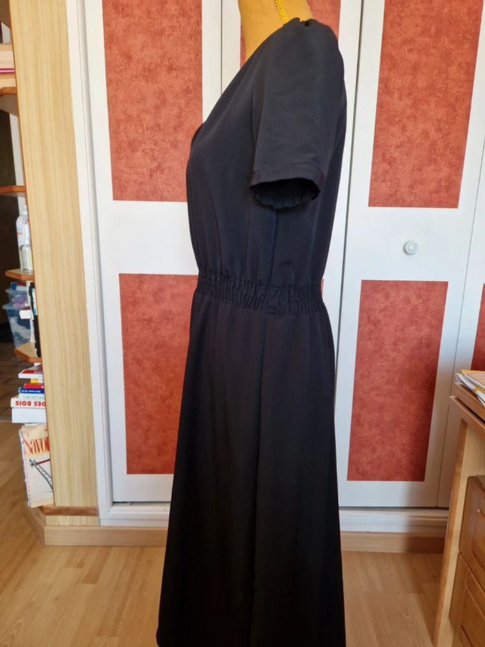 Robe longue été en très bon état. Non doublée. Asymétrique plus longue au dos. Taille élastique. Petits boutons manches. Léger défaut ceinture pratiquement pas visible. Voir photo.
