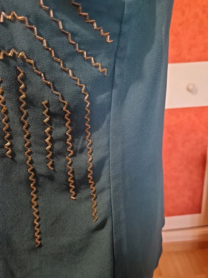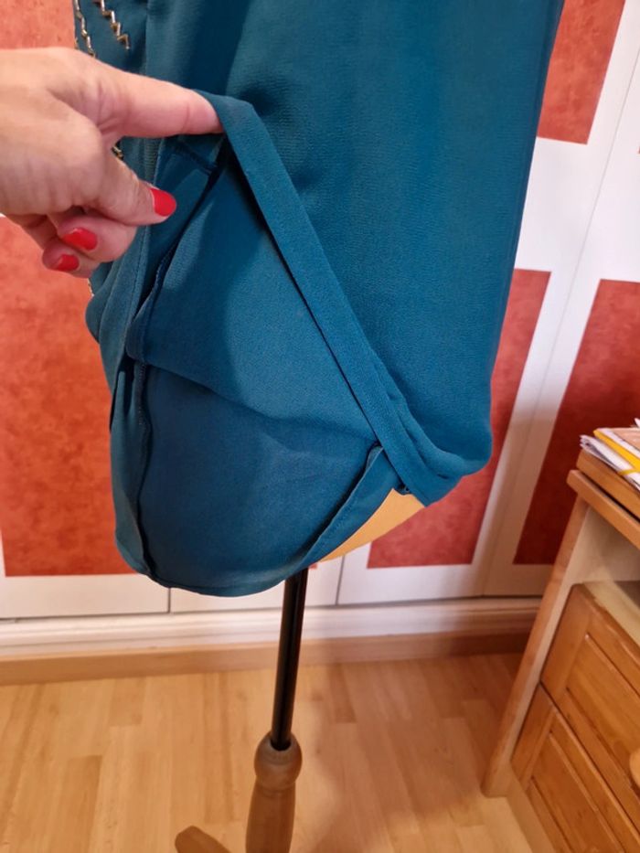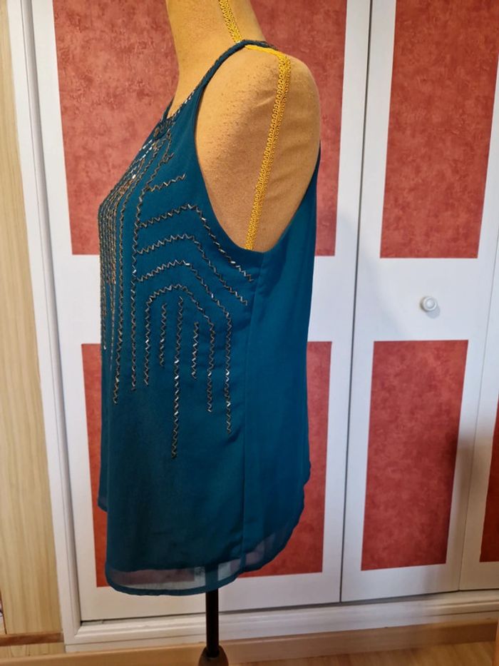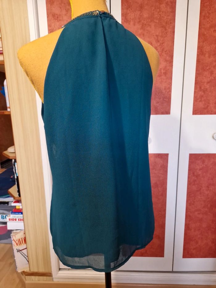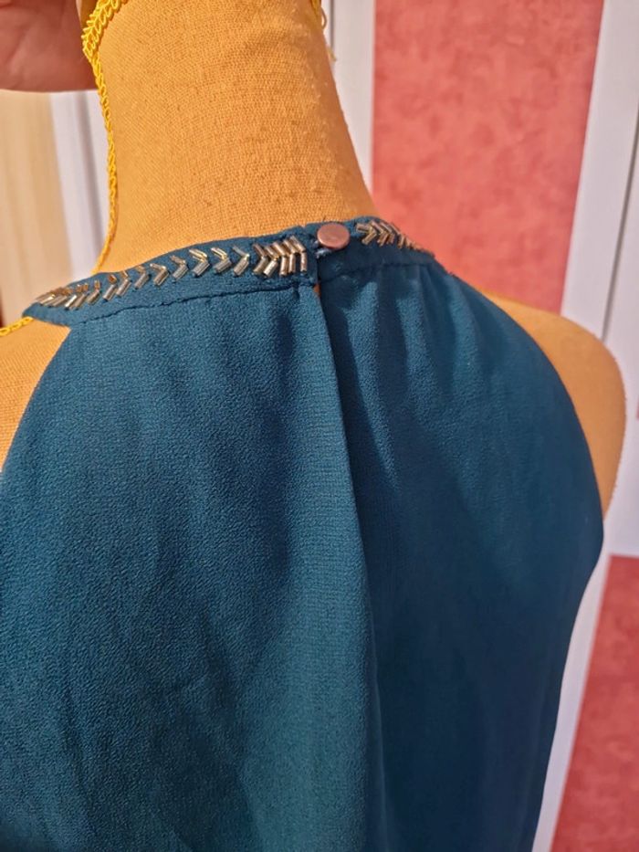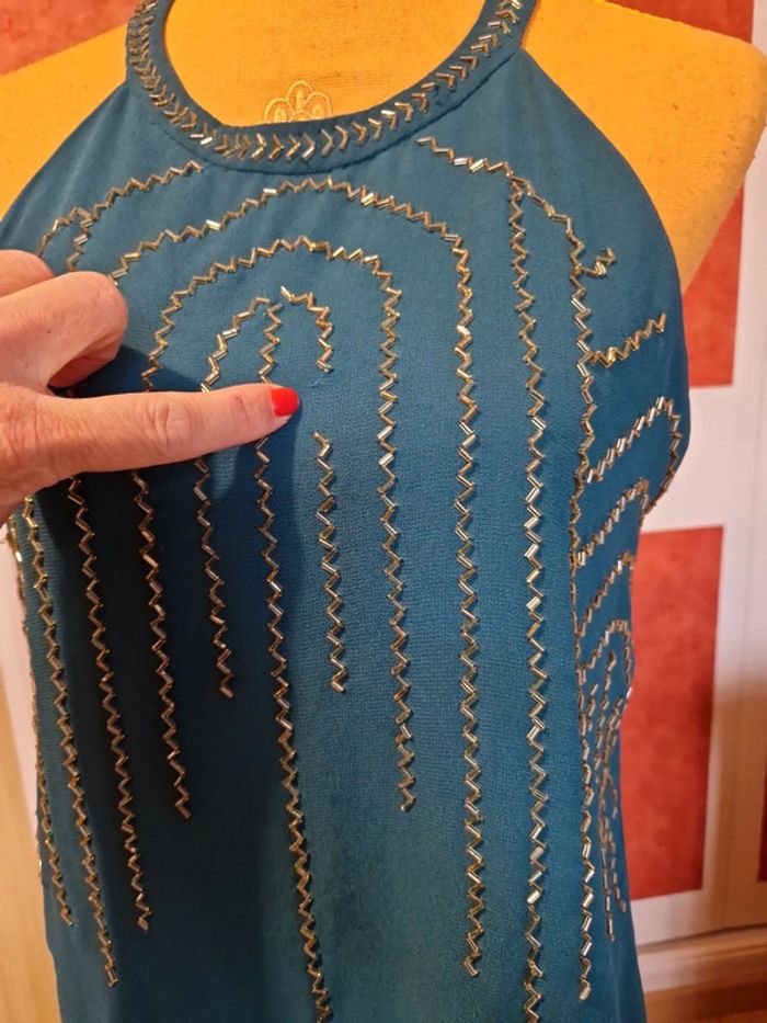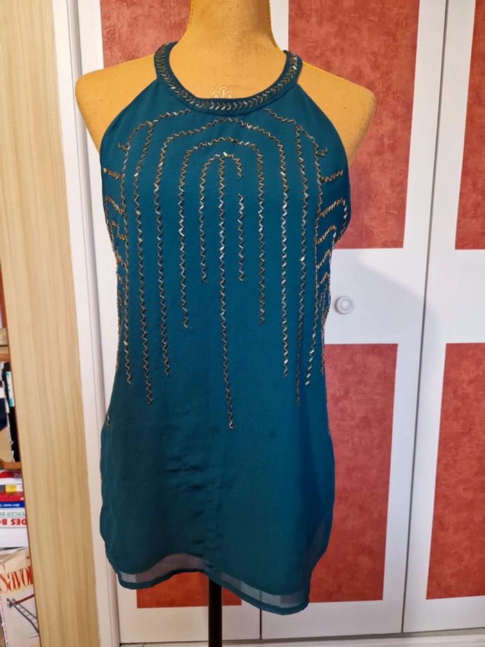 Top en bon état. Manque quelques petites perles. Et 2 tâches voir photos. Le haut est doublée. Et fermé par un bouton dans la nuque. Étiquette composition et taille coupé.