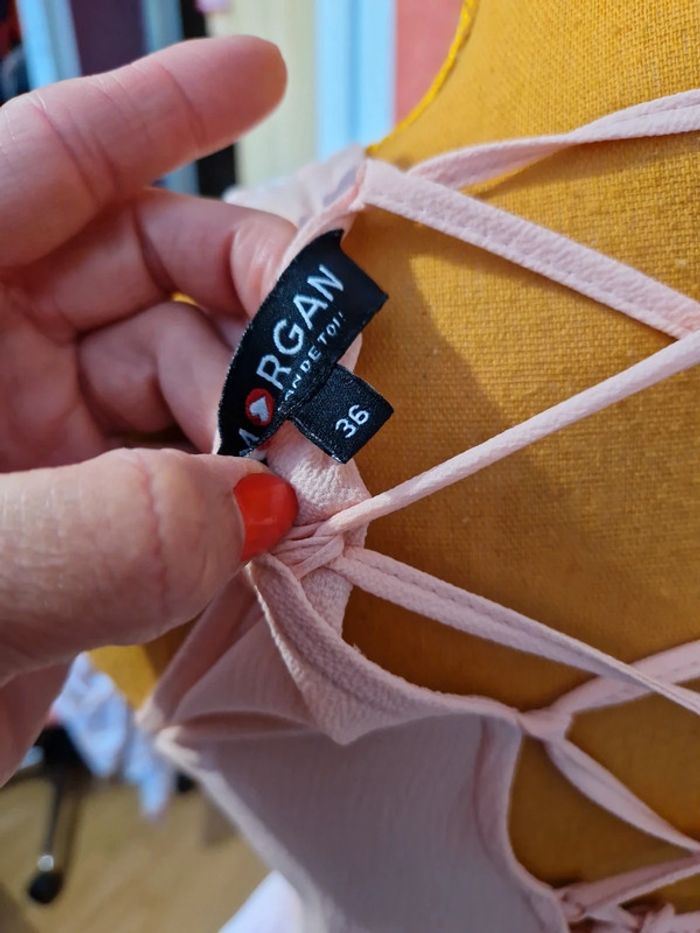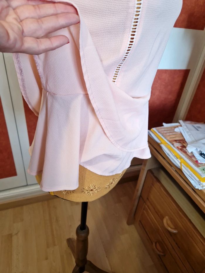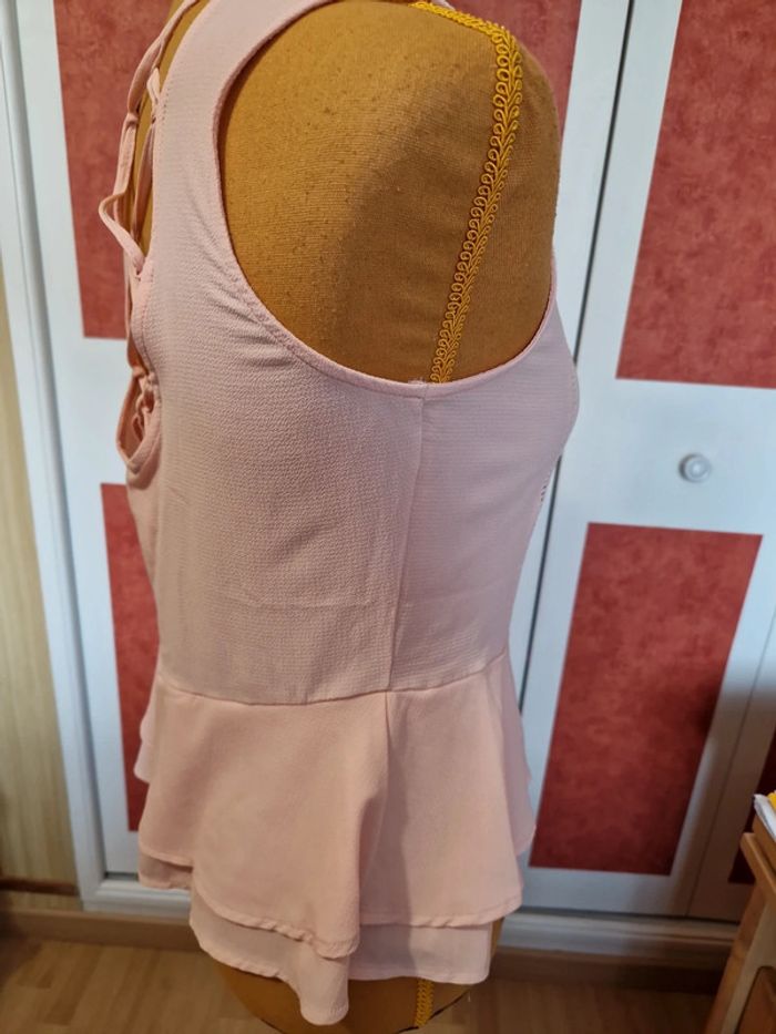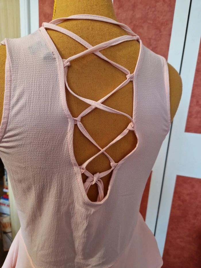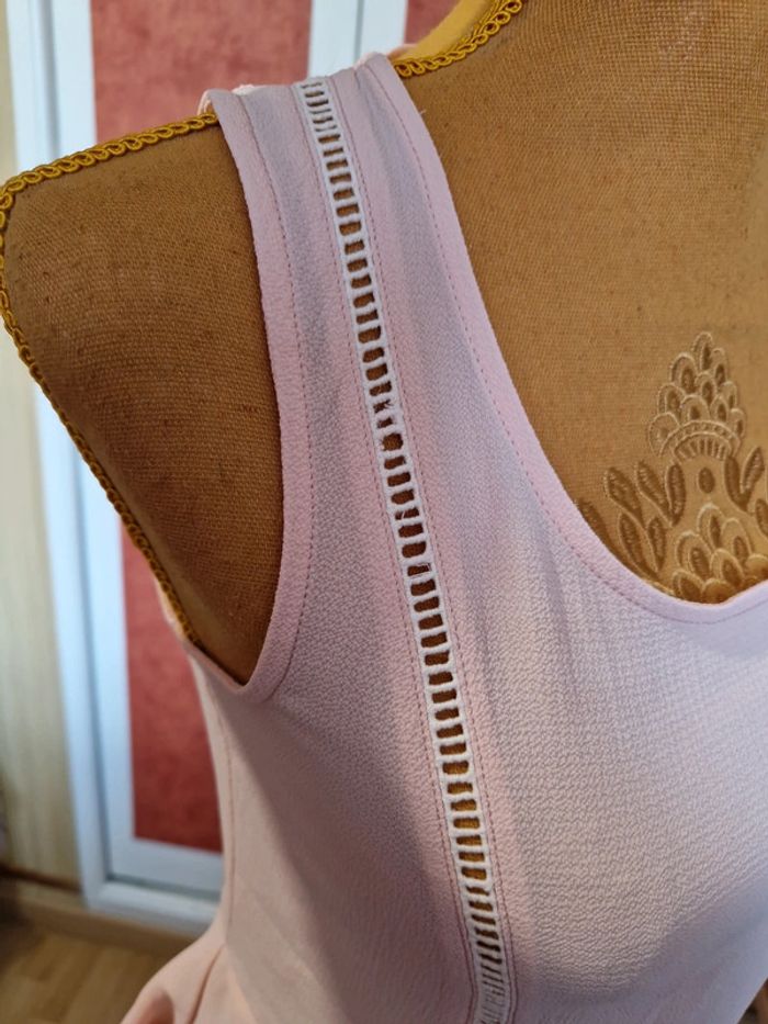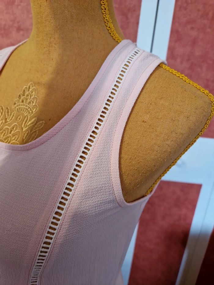 Haut sans manches en très bon état. Dos avec laçage. Matière légère. Couleur rose poudré. Étiquette composition et taille coupé.