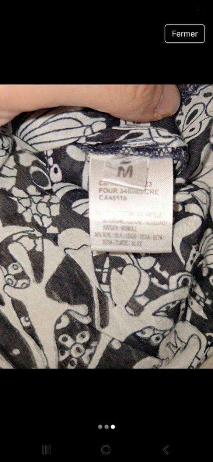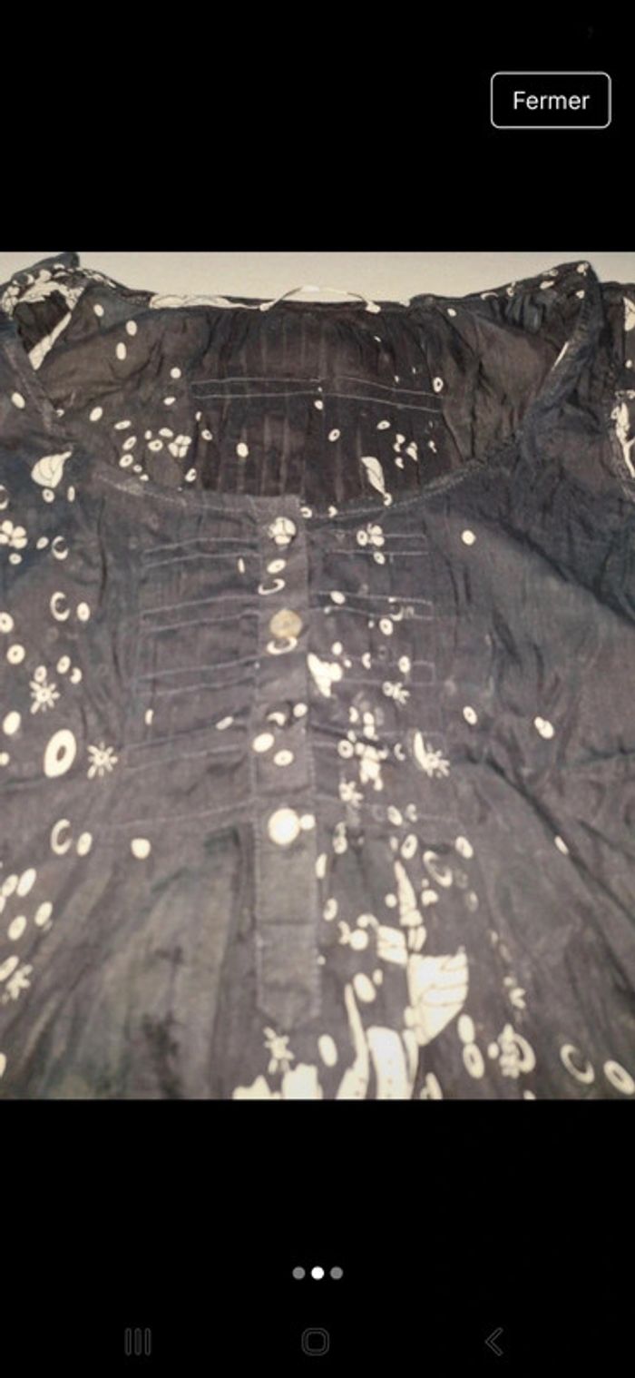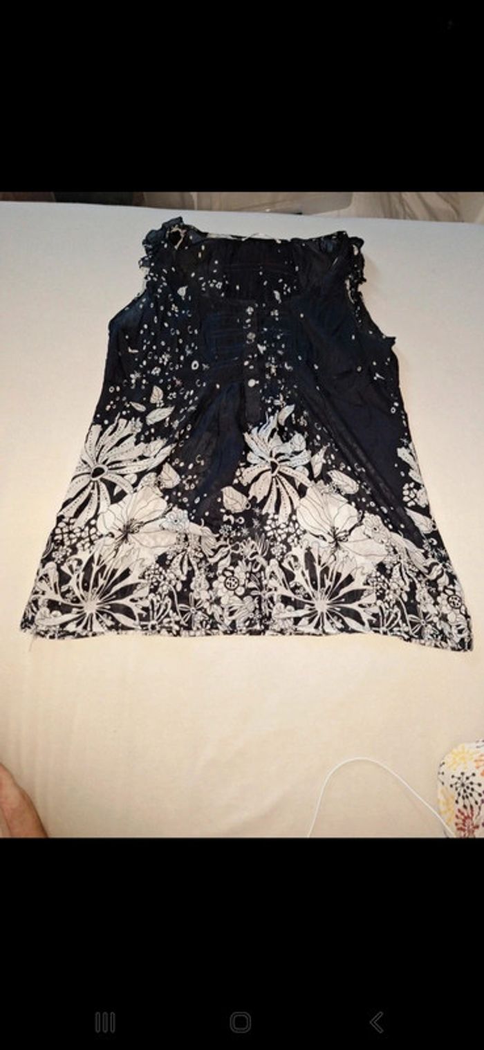 Débardeur blouse bleu marine avec joli dessin blanc de marque DDP, de taille M Un peu transparent Très bon état Réductions sur lot activées