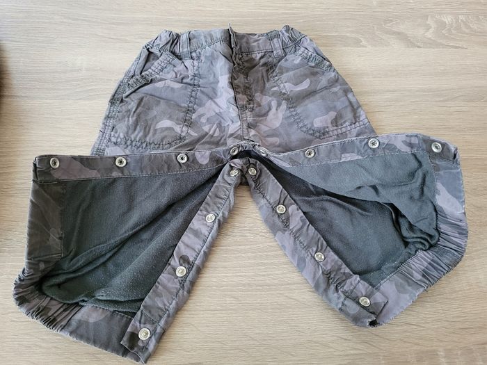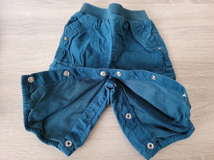 Vend lot de 3 pantalons garçon avec ouverture à l'entrejambe afin de faciliter le change, taille 6 mois en bon état juste une pression qui est cassée (voir photos).