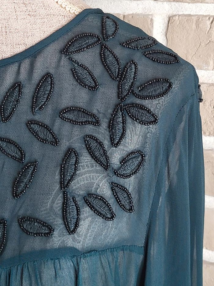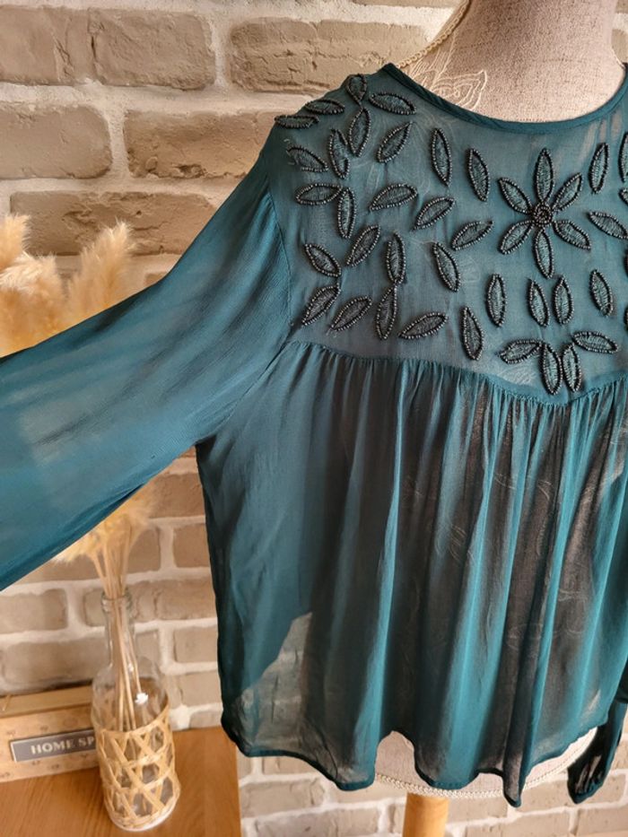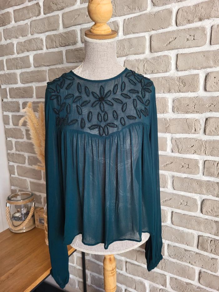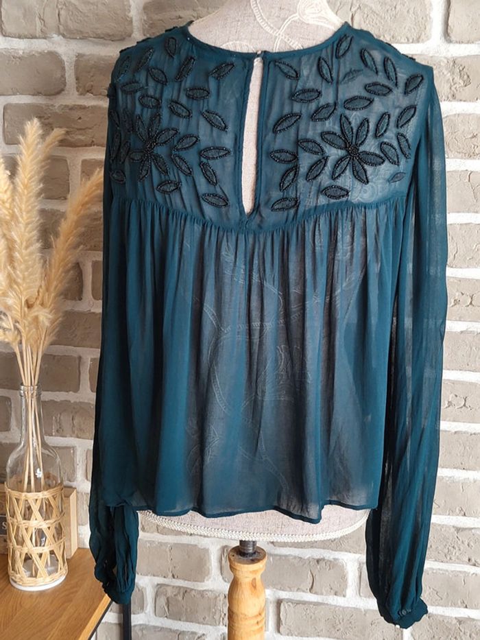 💝 Bénéficiez d'une réduction en créant lot dans mon dressing 🛍️ 🌸 Blouse fluide Mango souvent portée, il peut y avoir de très légères imperfections au niveau des coutures 🎀 Voile transparent de couleur vert sapin foncé À porter avec un top ou un soutien gorge nude 🪷 Détail brodé avec un motif floral avec des perles noires sur le haut, devant et derrière Coupe légèrement ample et manches longues boutonnées aux poignets, par de jolis boutons blancs, comme à la nuque 🍥 Taille XS 34 🩷 À associer avec un jean taille haute et des bottines pour un look casual chic Parfaite sous un blazer noir pour une tenue de bureau élégante. Si vous aimez le look bohème, portez-la avec une jupe longue et des sandales