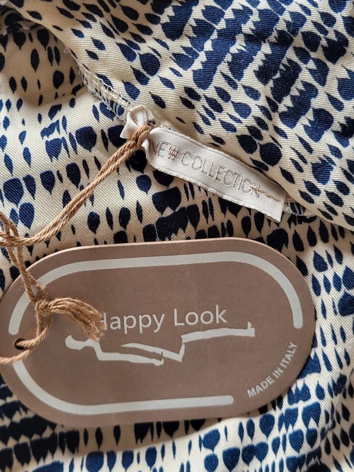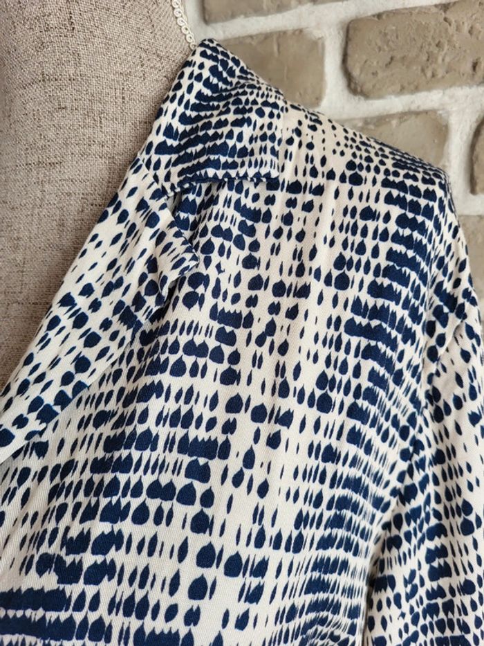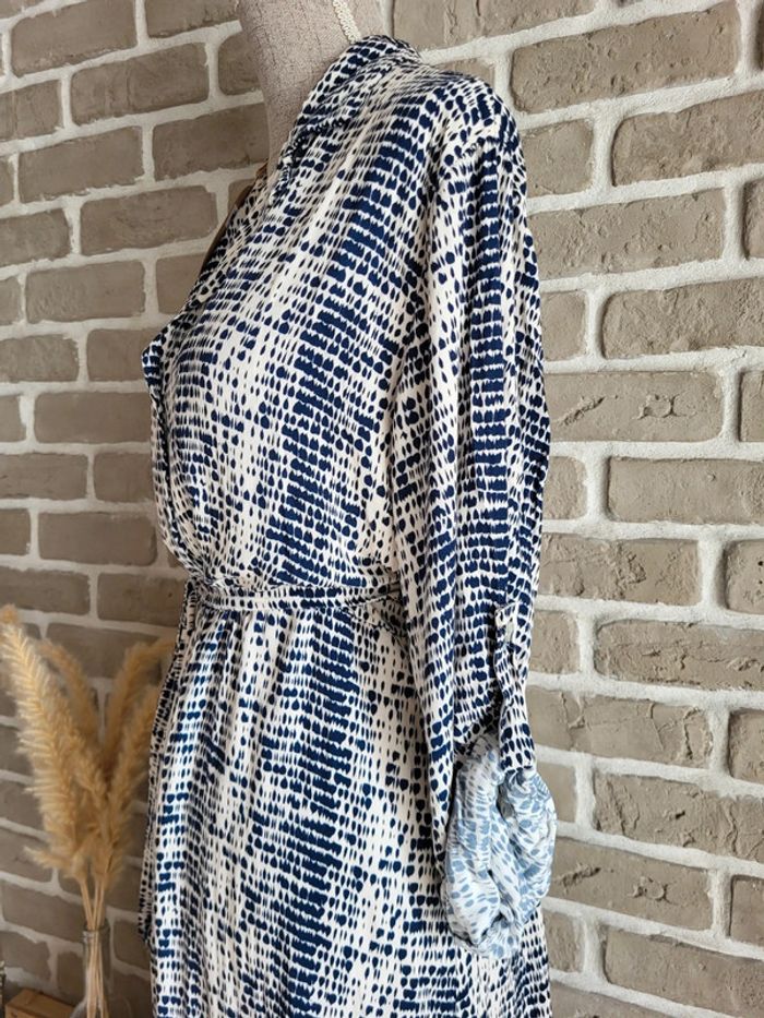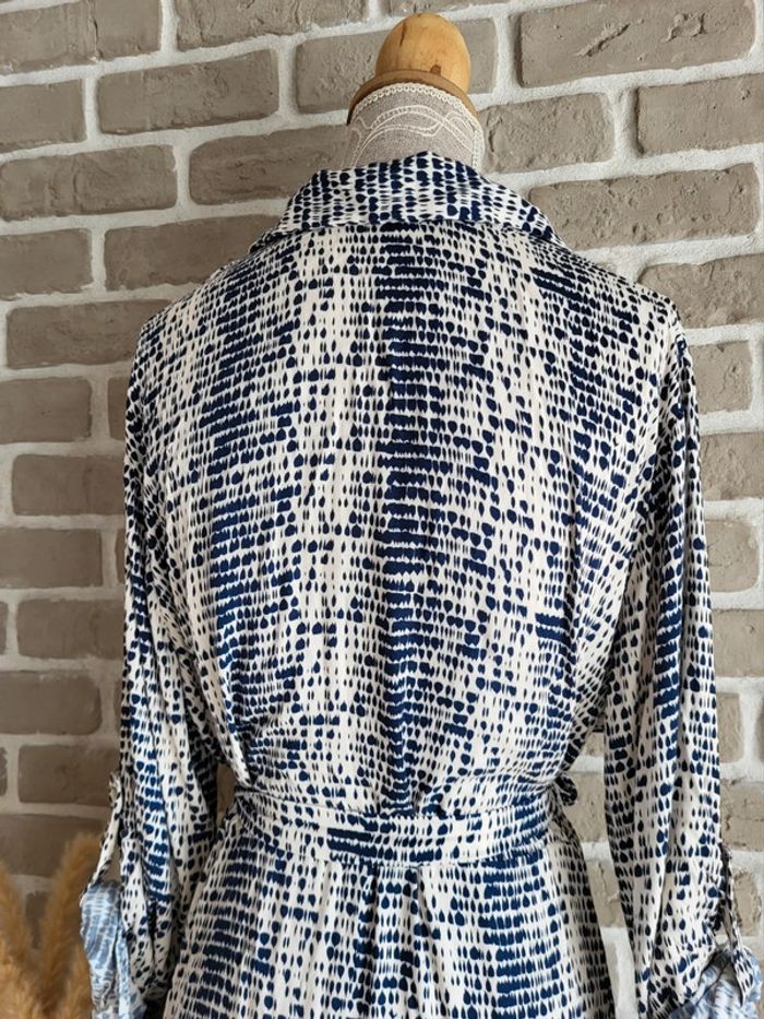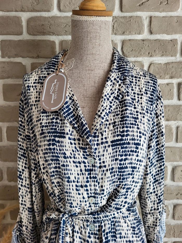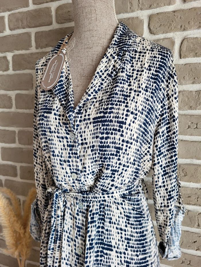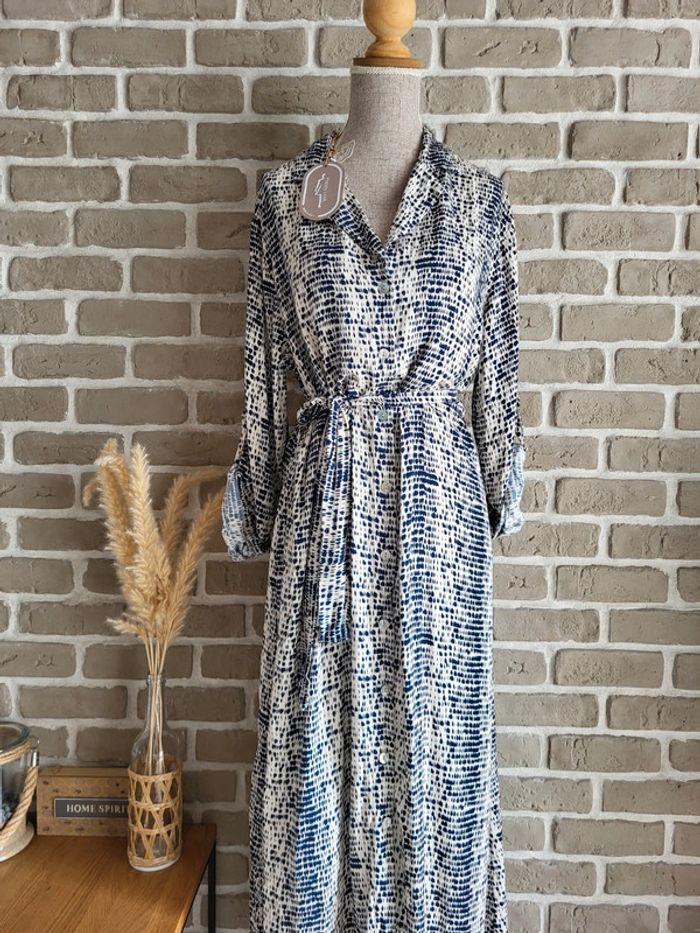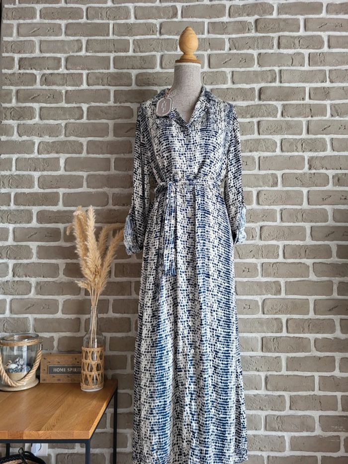 💝 Bénéficiez d'une réduction en créant lot dans mon dressing 🛍️ 🌸 Très jolie robe longue fabriquée en Italie, de la marque New Collection Neuve avec étiquette 🎀 Tissu fluide avec un imprimé graphique style tache d'encre bleu marine sur fond crème 🪷 Coupe chemise, entièrement boutonnée sur l'avant, avec ceinture amovible à nouer pour marquer la taille Manches longues pouvant être retroussées grâce à un système d'attache 🍥 Taille Unique, s'adapte à toutes les morphologies par sa coupe ample et sa ceinture Longueur 126 cm 🩷 Un style casual avec beaucoup d'élégance qui peut être portée au quotidien avec des sandales et une veste en jean, au bureau avec des talons et un blazer ou en soirée avec de mules et des bijoux