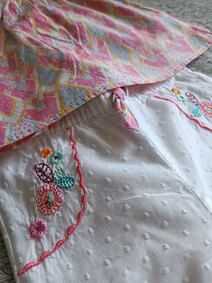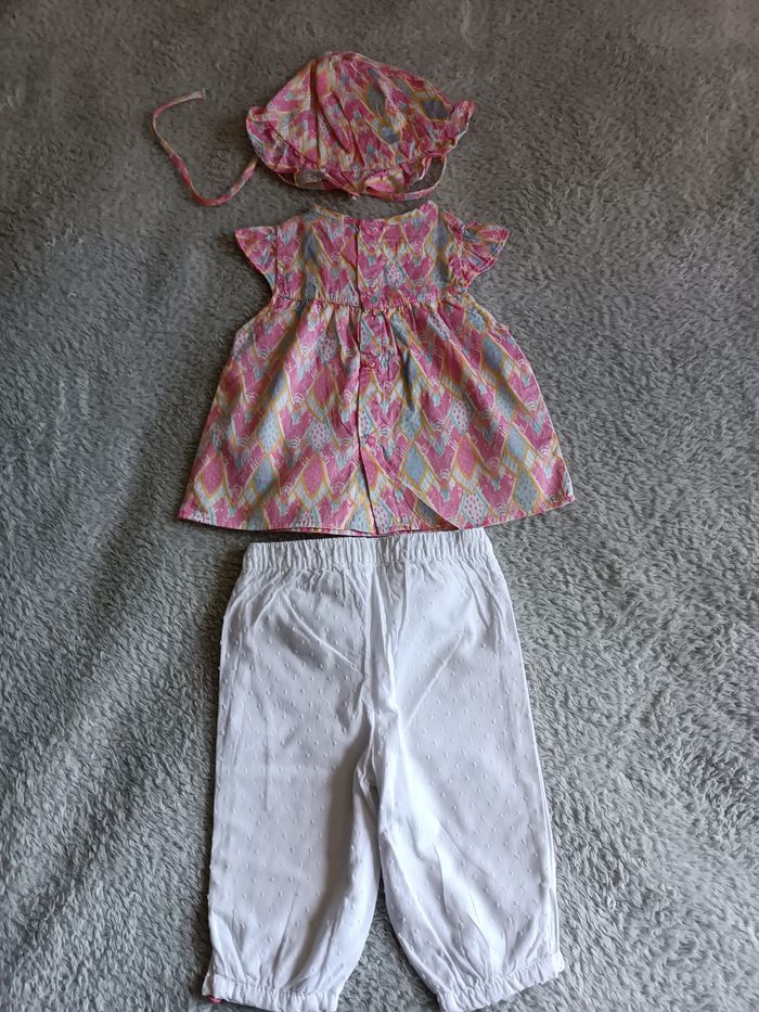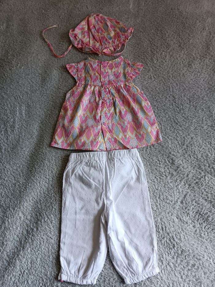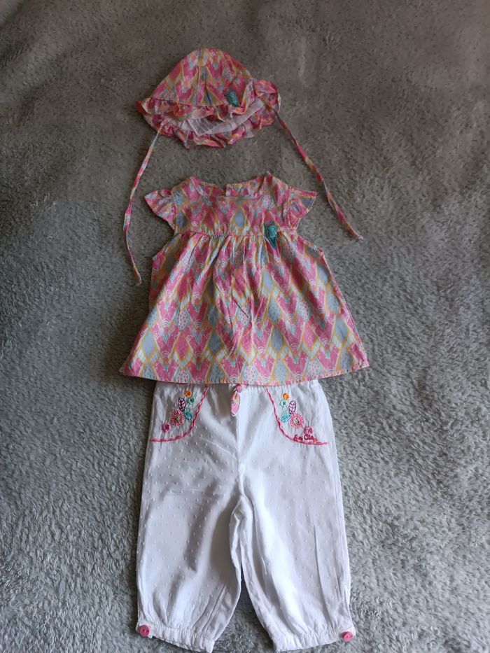 Magnifique ensemble 6 mois jamais porté composé -Blouse à motif - pantalon léger blanc avec rappel des motifs - 1 chapeau (non repassé) Pensez à faire des lots les remises sont activés. Dressing moderne et à petit prix.