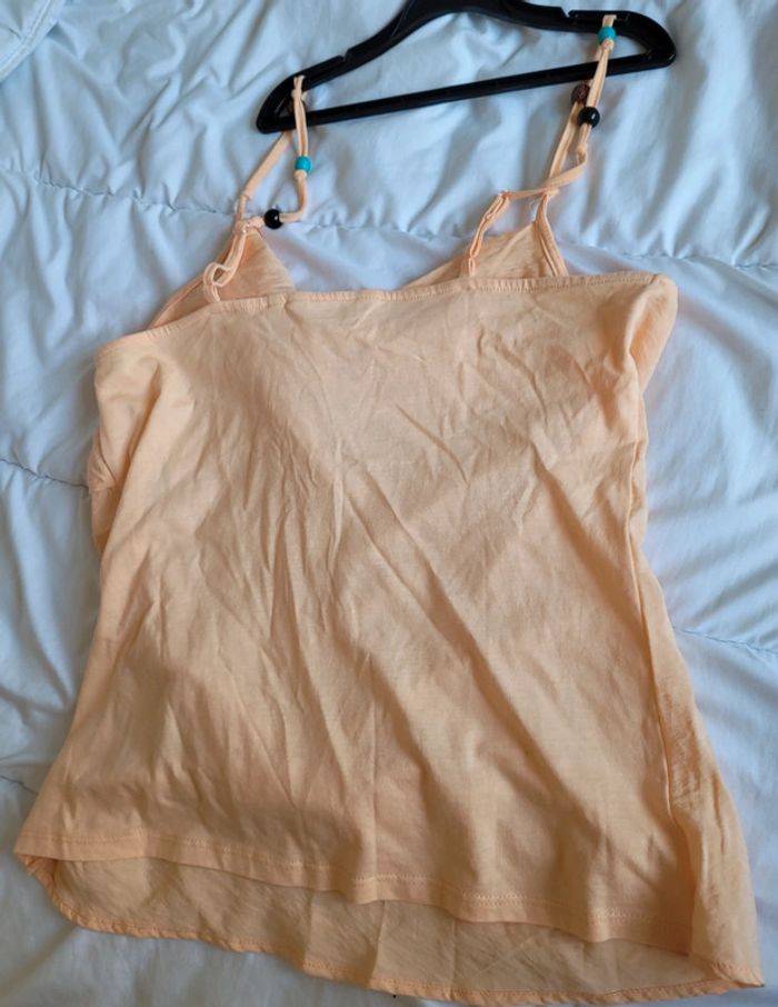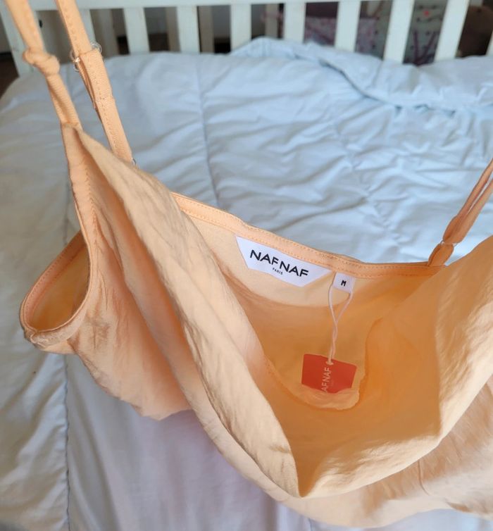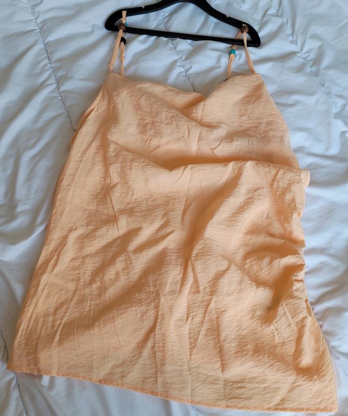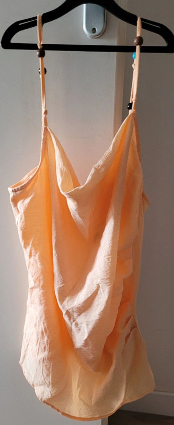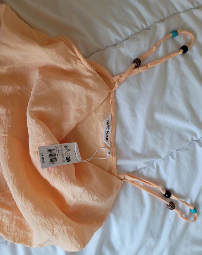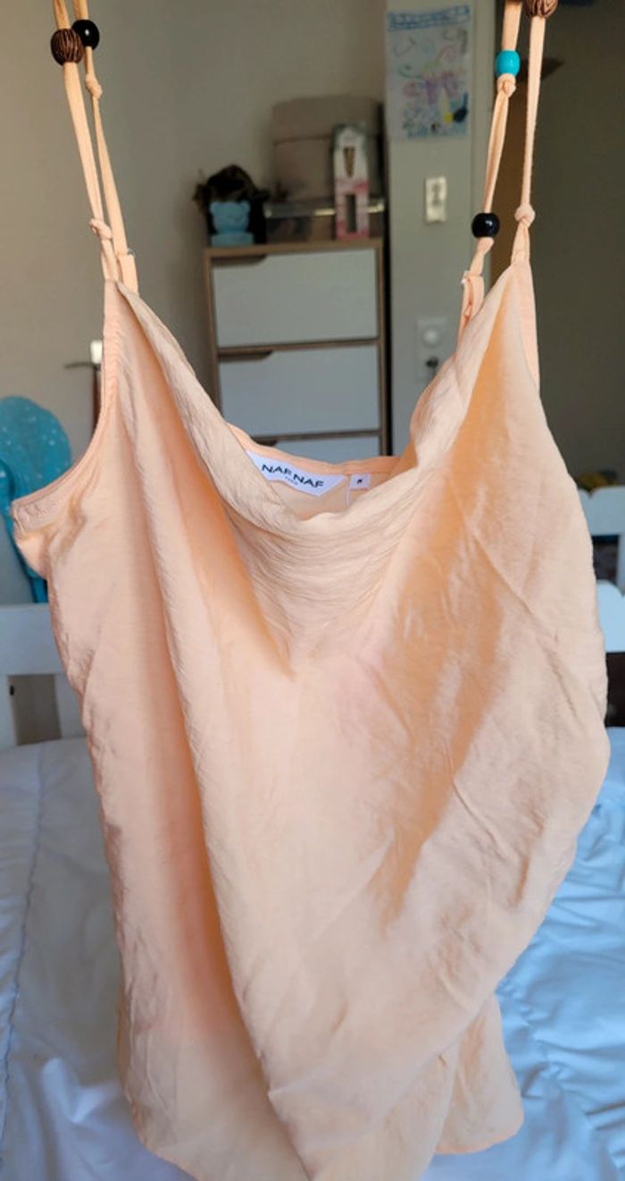 Caraco à fines bretelles. Perles décoratives. Drapé sur le devant. Coloris : pêche, perles turquoises et noires Matière : 87% viscose, 13% polyamide Marque Naf Naf taille M. Neuf avec étiquette, jamais lavé ni porté. #femme_baptlily