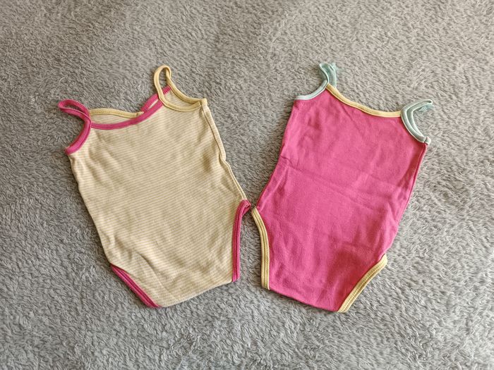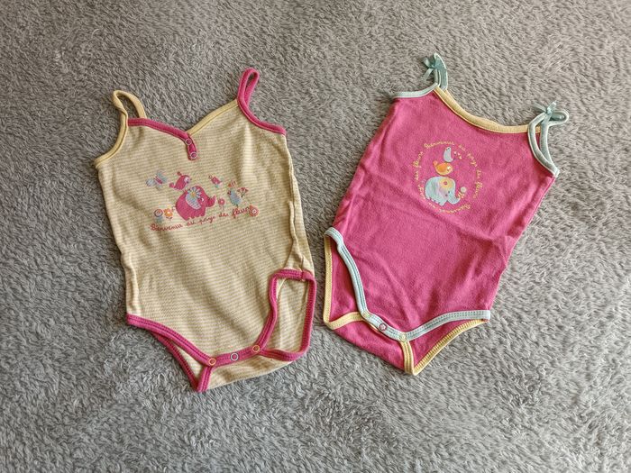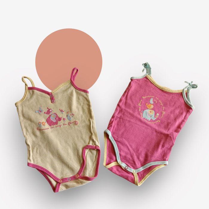 Lot de 2 bodies bretelles imprimé éléphant en 9mois en super état. Pensez à faire des lots les remises sont activés. Dressing moderne et à petit prix.