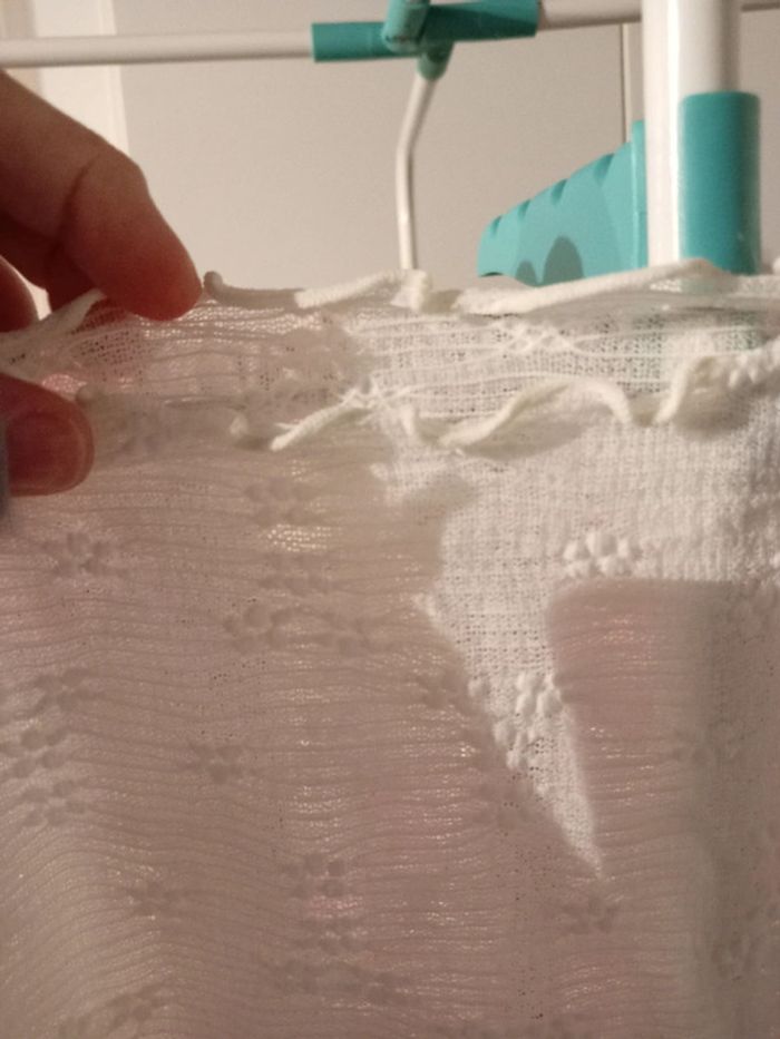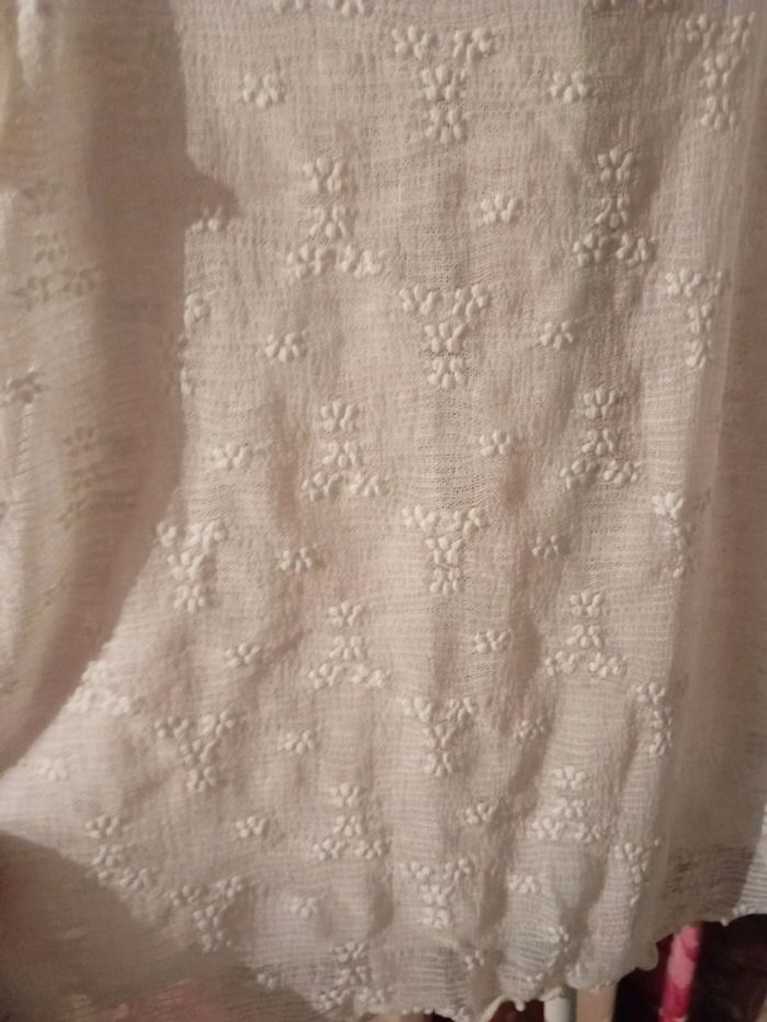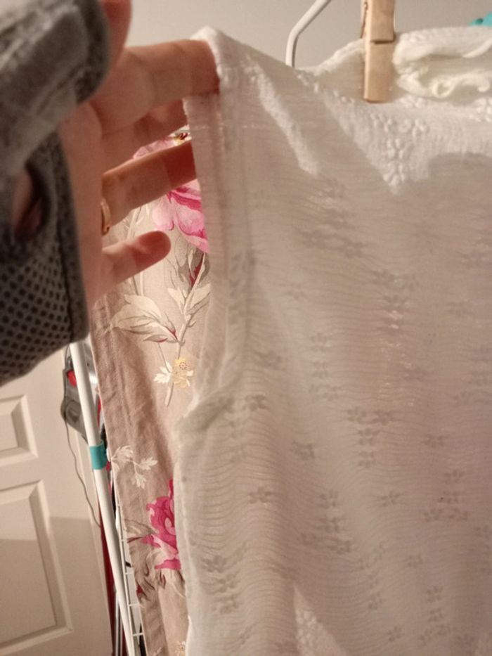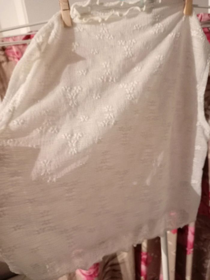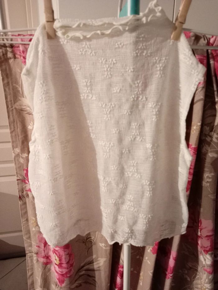 Top court dentelle. Col ondulé. Très jolie. Écru. Neuf. Matière élastique et moulant. Va du 42/44/46. Pensez au lot 🌸