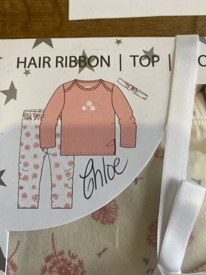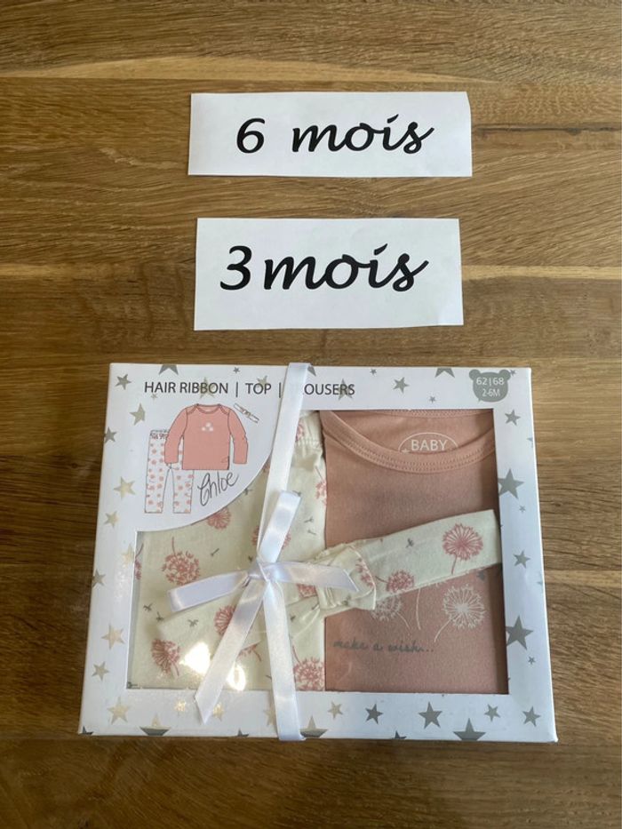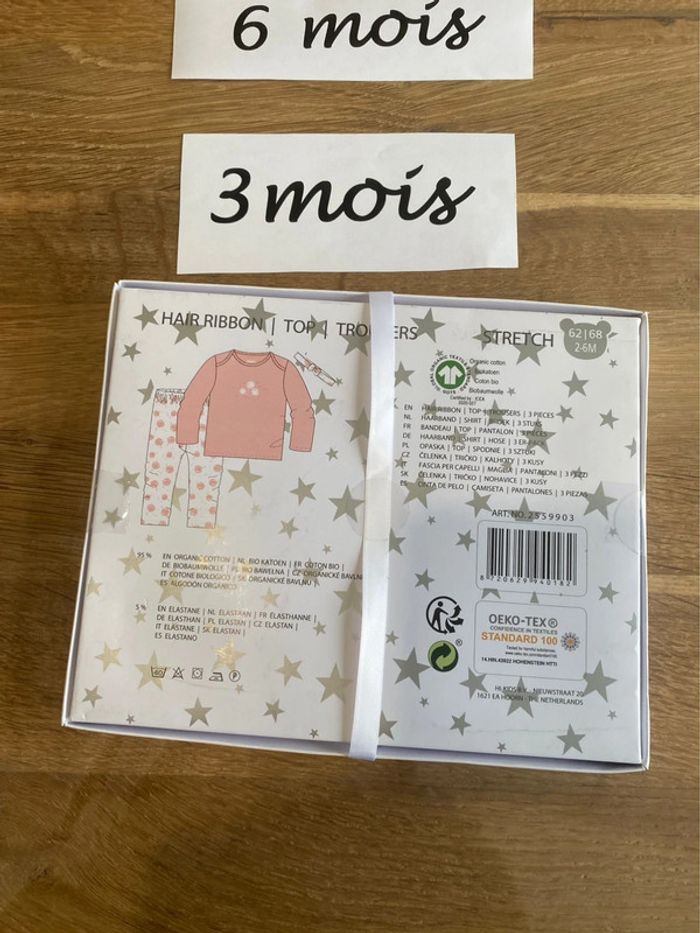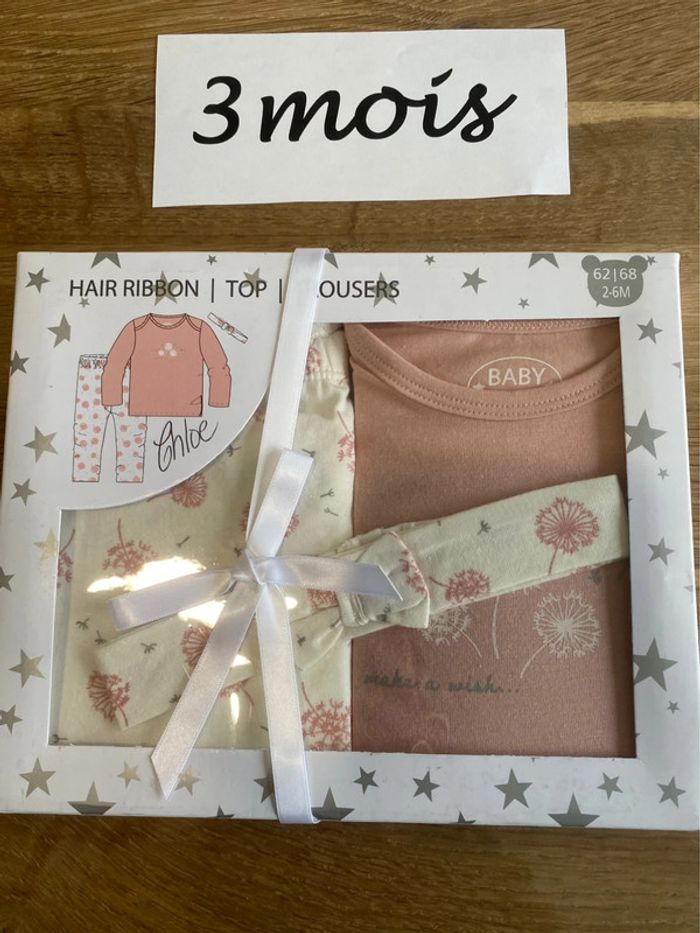 Ensemble legging tee-shirt et bandeau neuf dans la boîte. Taille 2-6 mois. ⚠️ attention sur la boîte il y a d’écrit le prénom « Chloé » voir photo!
