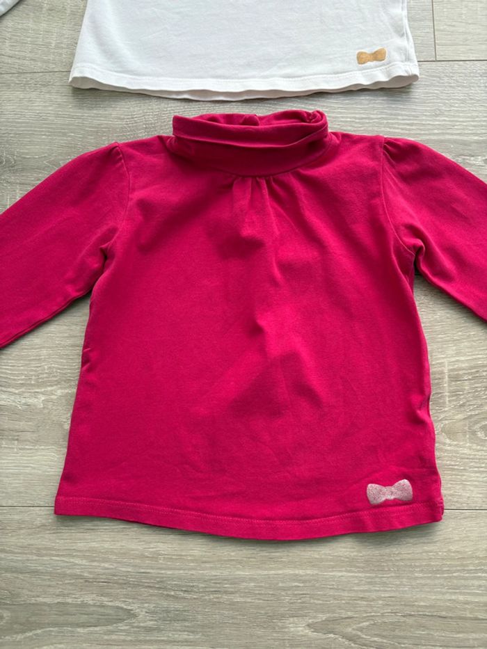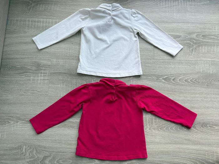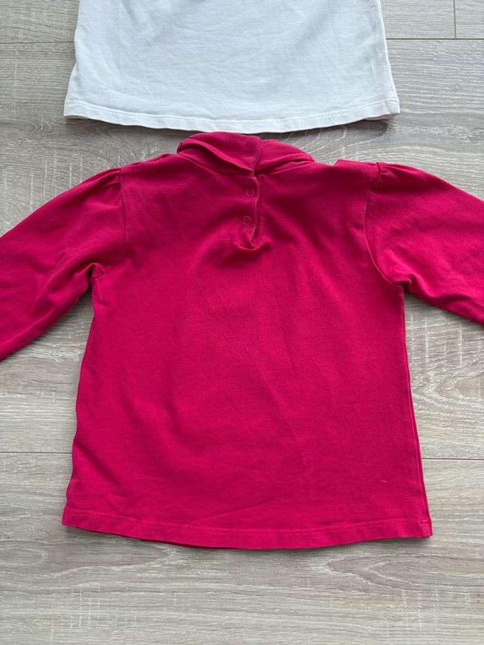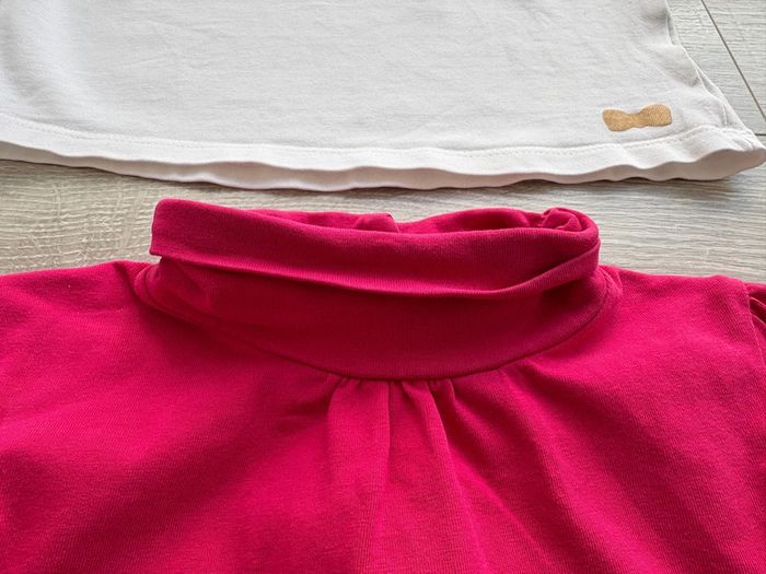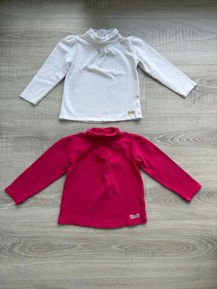 2 sous pulls de la marque Tape à l’œil. Un sous pull blanc couleur impeccable. Un rose plus fushia. Taille 23 mois. Ils sont en excellent état. Pas de tache ou autre! Je vends d’autre sous pulls dans mon dressing. Maison non fumeur et sans animaux.