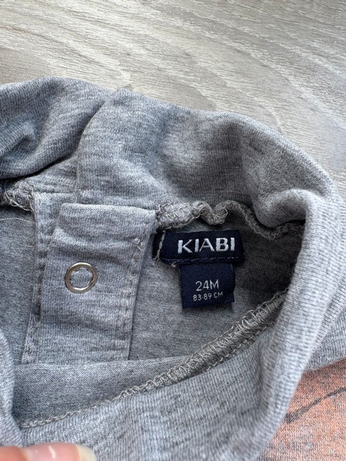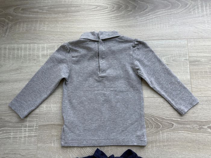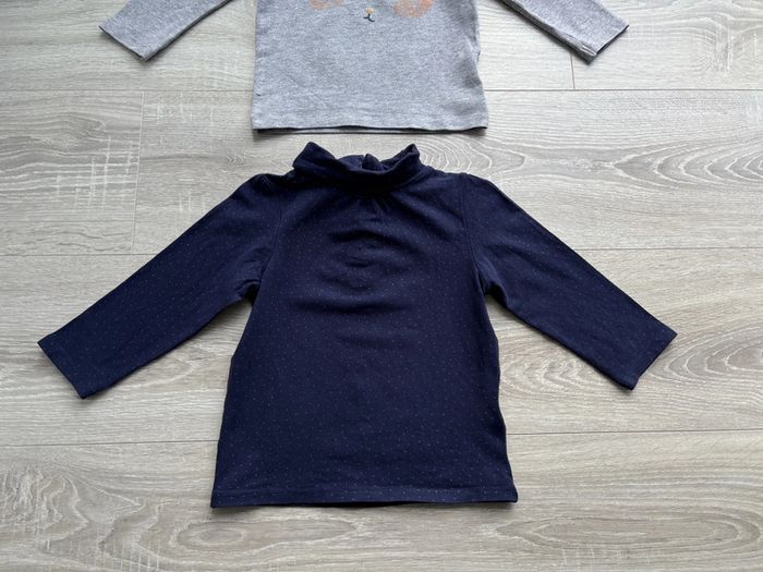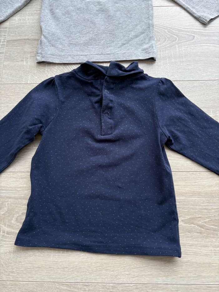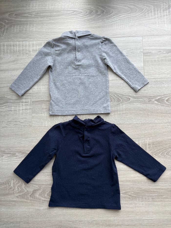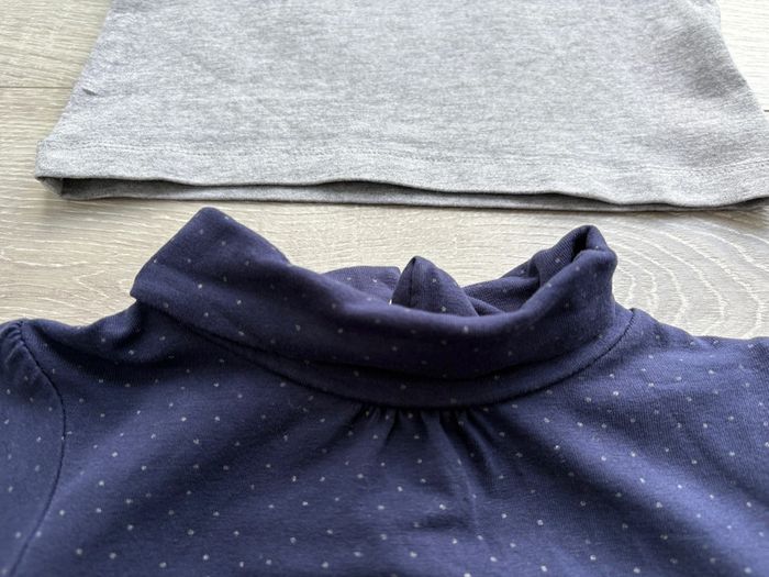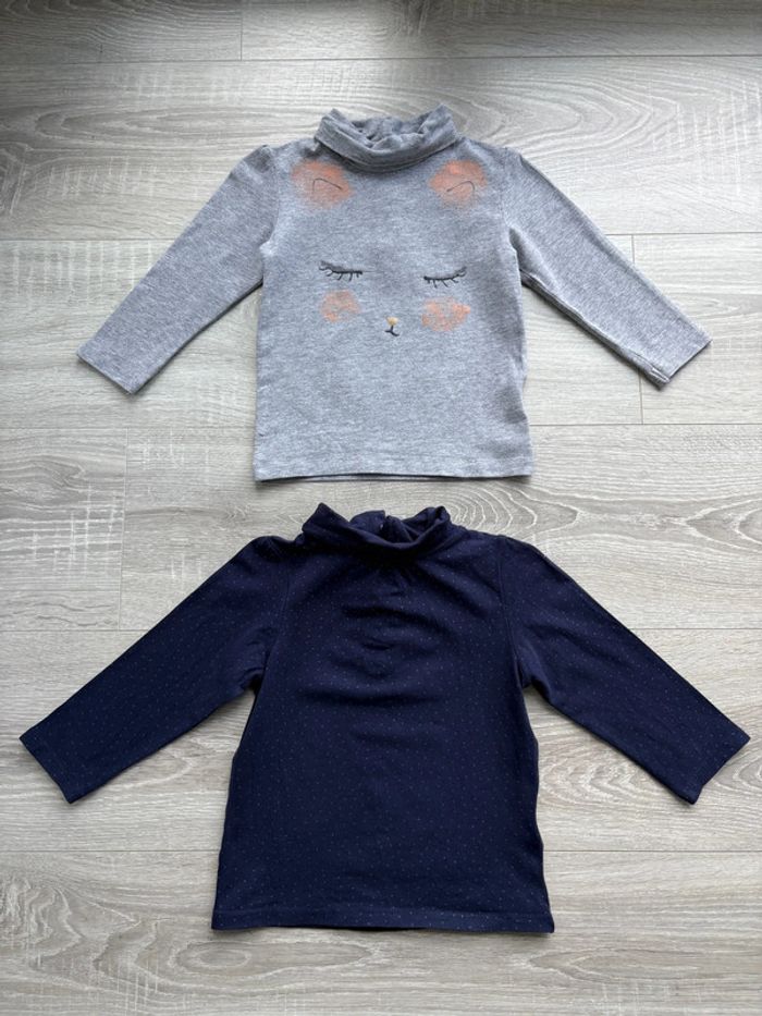 2 sous pulls de la marque Kiabi. Un sous pull bleu marine à pois gris décousu à l’arrière en bas (voir photo). Un gris comme neuf car très peu porté. Taille 24 mois. Je vends d’autre sous pulls dans mon dressing. Maison non fumeur et sans animaux.